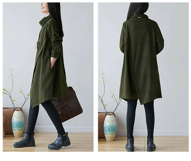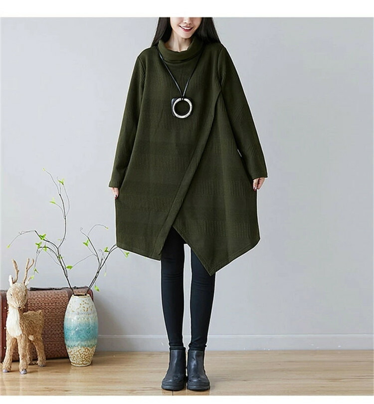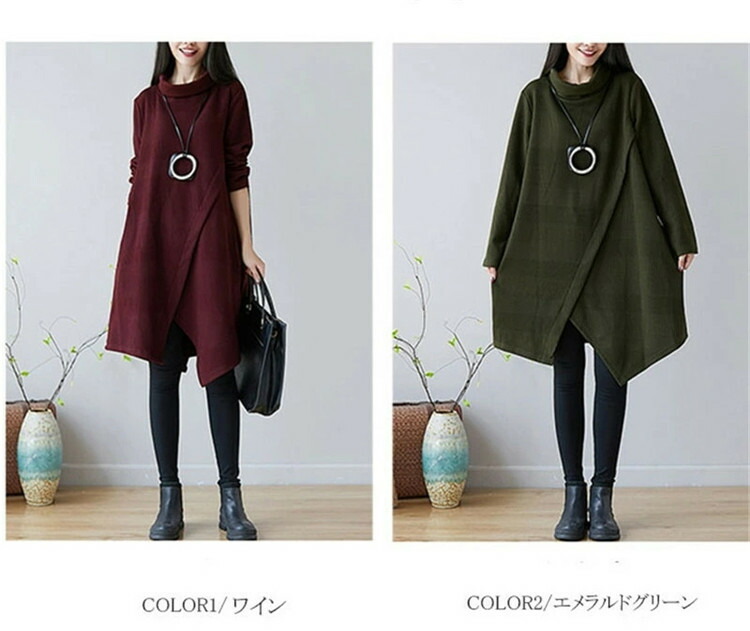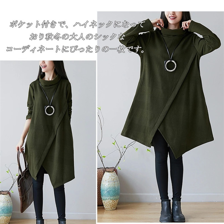 商品名 チュニック ワンピース レディース 秋冬 長袖チュニック 厚手 長袖 膝丈ワンピース ハイネックワンピース ワンピース ゆったり ロングワンピ ロング丈 プルオーバー 体型カバー Aライン 秋 冬 着痩せ 無地 不規則 大きいサイズ