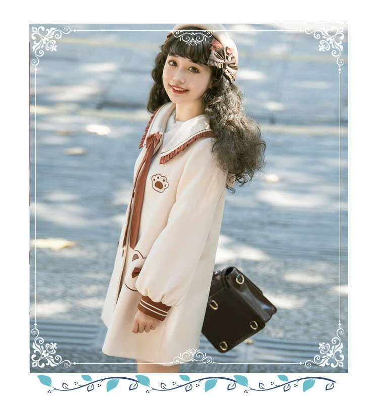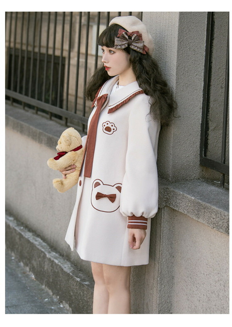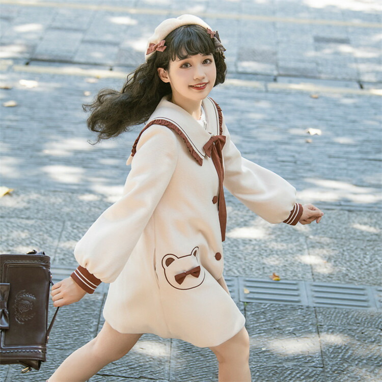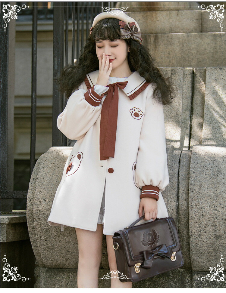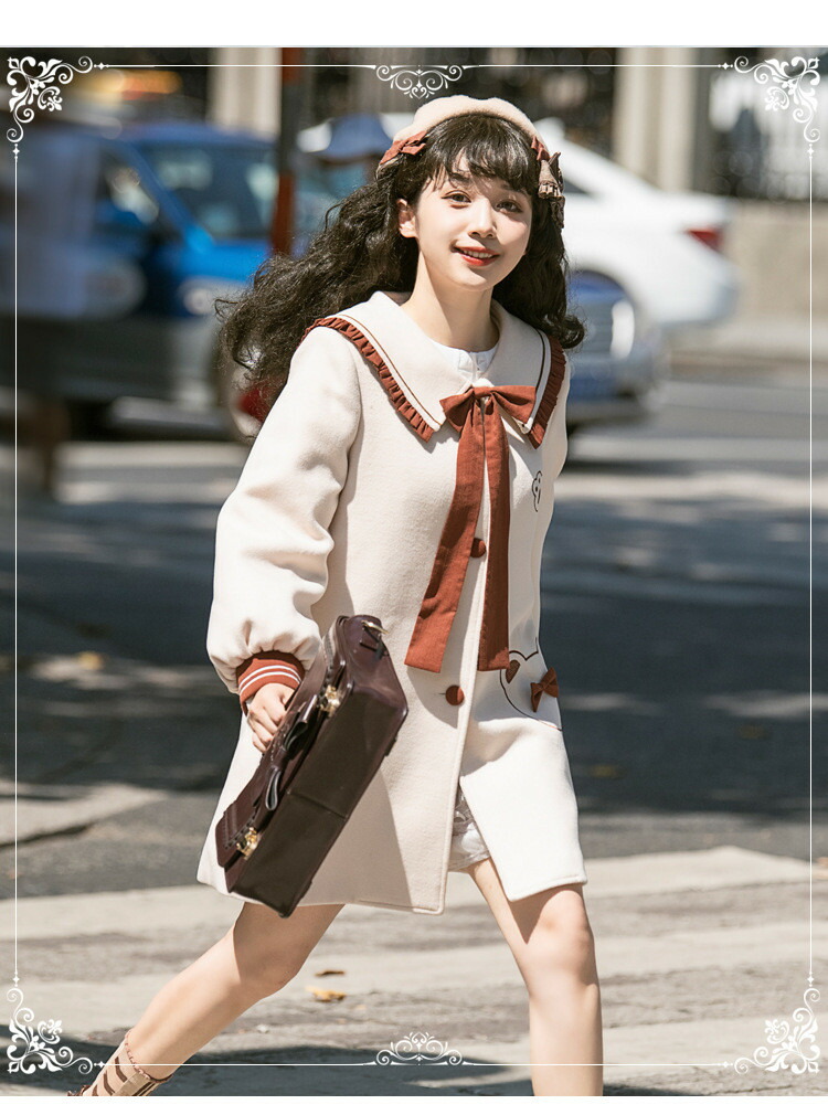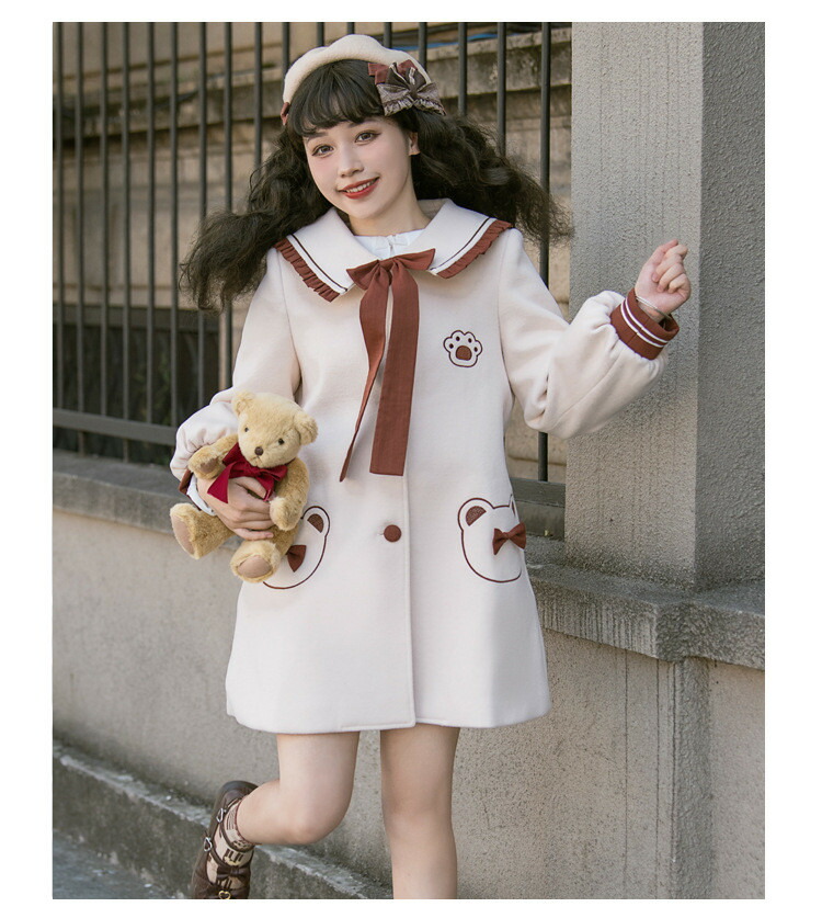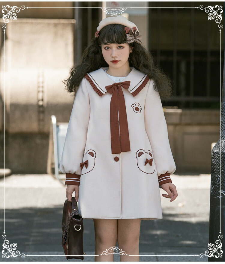 商品名 ロリータ 冬服 リボン レディース ステンカラーコート トップス アウター ジャケット ショートコート 小柄 可愛い 学生 通学 通勤 着 せ 女の子 長袖 衣装 ゴスロリ 厚手 防寒 寒さ対策 秋冬 柔らかい 軽い着心地 暖かい ふんわり ベージュ