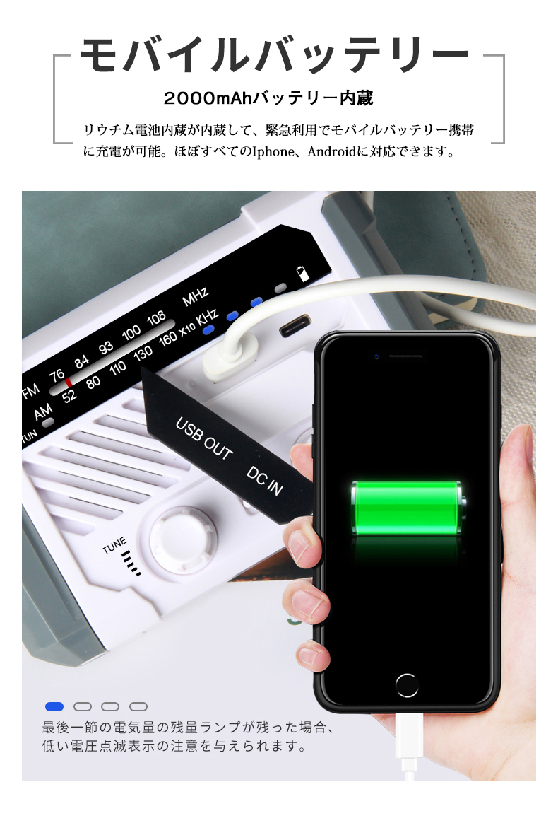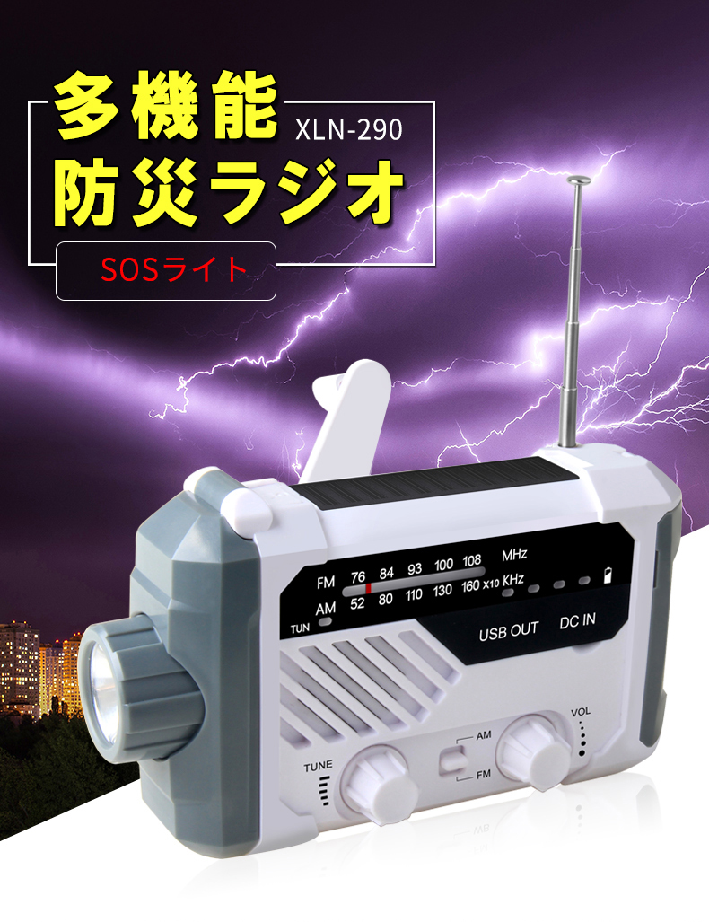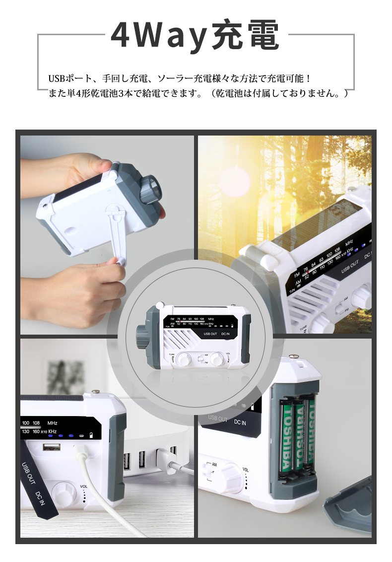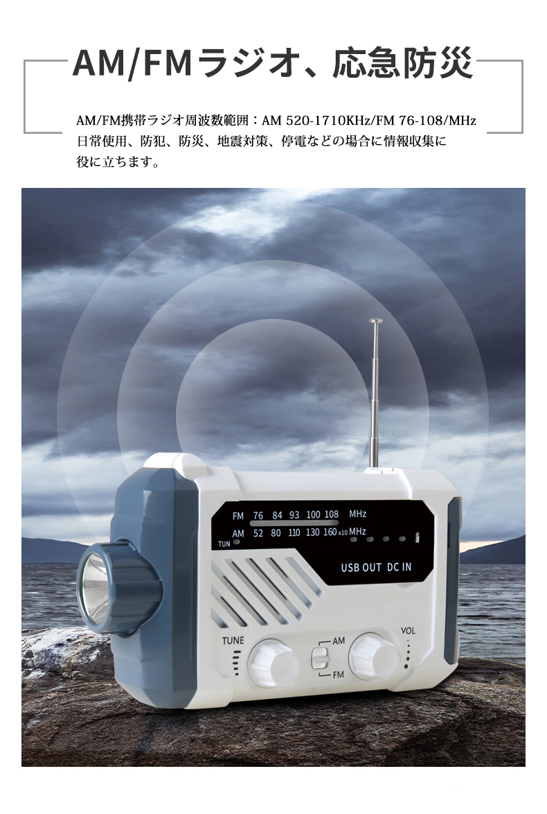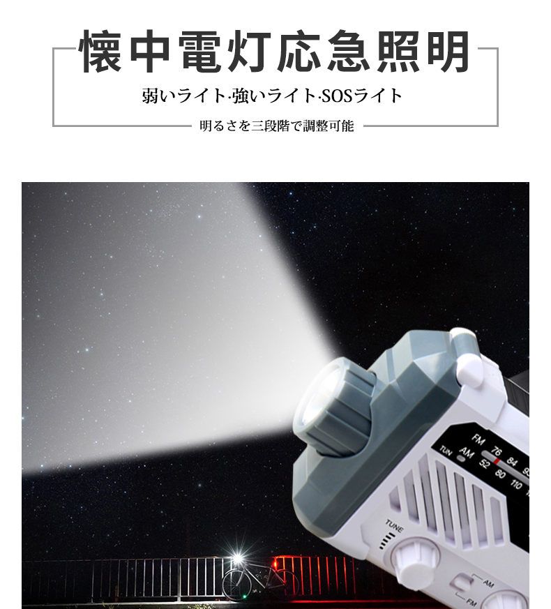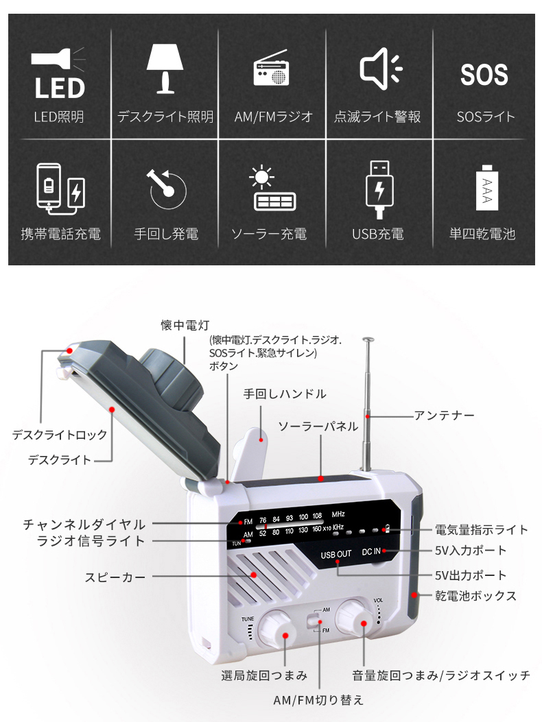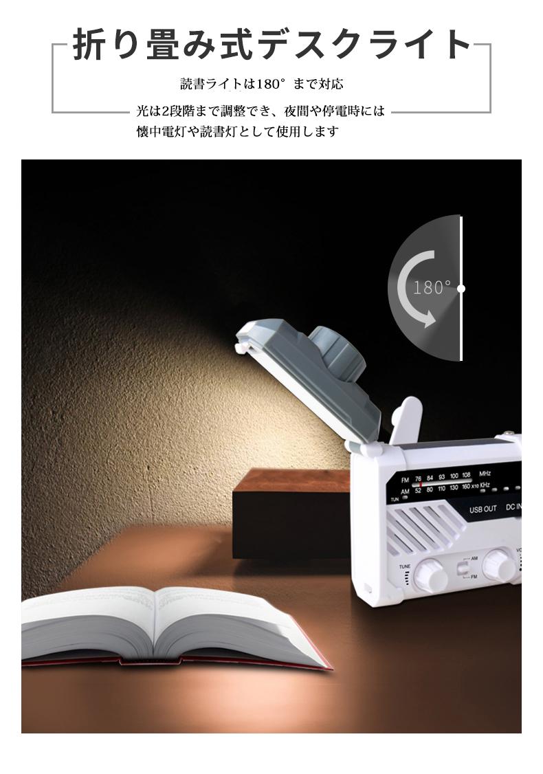 防災ラジオ FM AM 対応 日本語取扱説明書付 懐中電灯 SOSアラーム付き デスクライト バッテリー機能搭載 非常用に 停電対策 携帯ラジオ ソーラー発電 手回し発電可能 USB充電