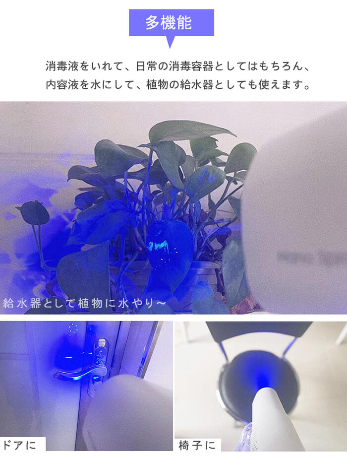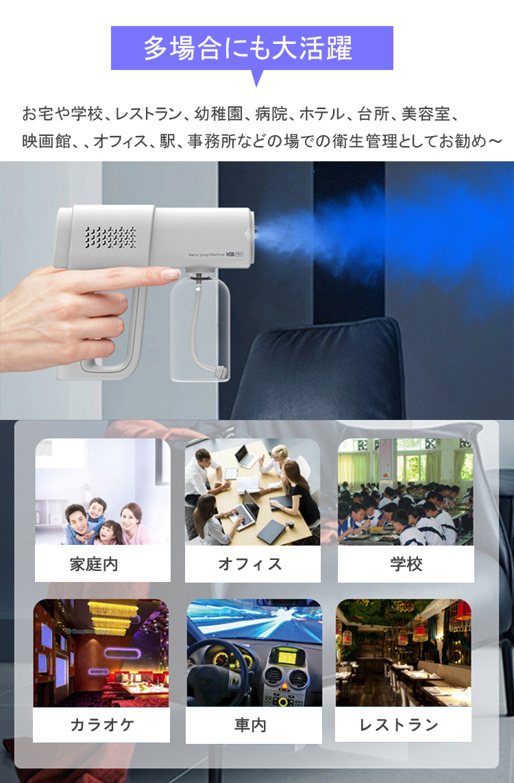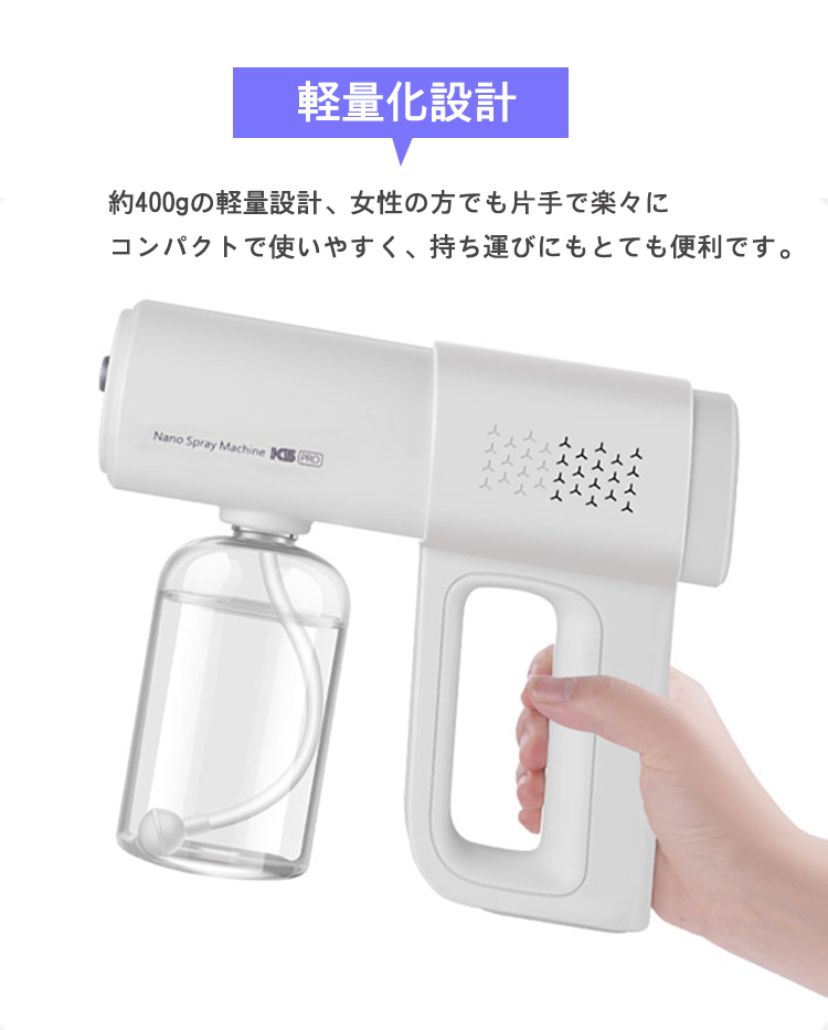 検索キーワード:ナノスプレーガン アルコール 次亜素塩酸水対応 霧吹き 電動スプレー 除菌液入り 日本語取扱説明書 アルコールディスペンサー UVライト コードレス 380ml 自動噴霧器 USB充電式 噴霧量調節可能 遠距離噴射 電動 スプレーガン ミストガン 噴射機 ナノレベル