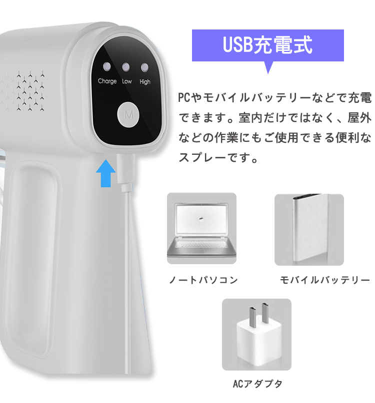 USB充電式 PCやモバイルバッテリーなどで充電 できます。室内だけではなく、屋外 などの作業にもご使用できる便利な スプレーです。