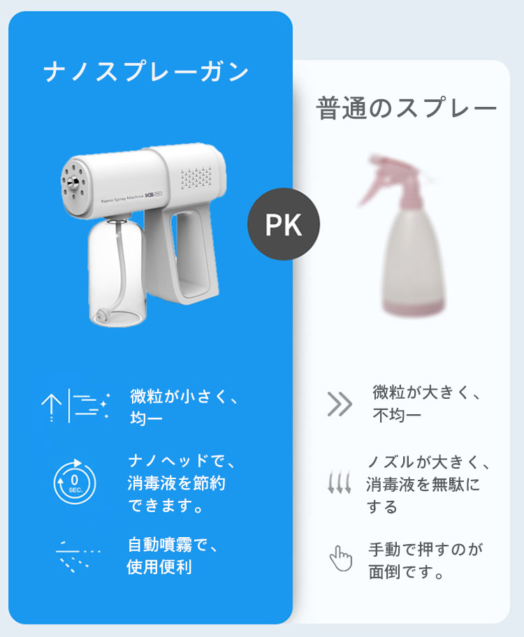 噴霧粒子が細かくて、普通のボトルスプレーと比べ、 消毒液の節約ができます。