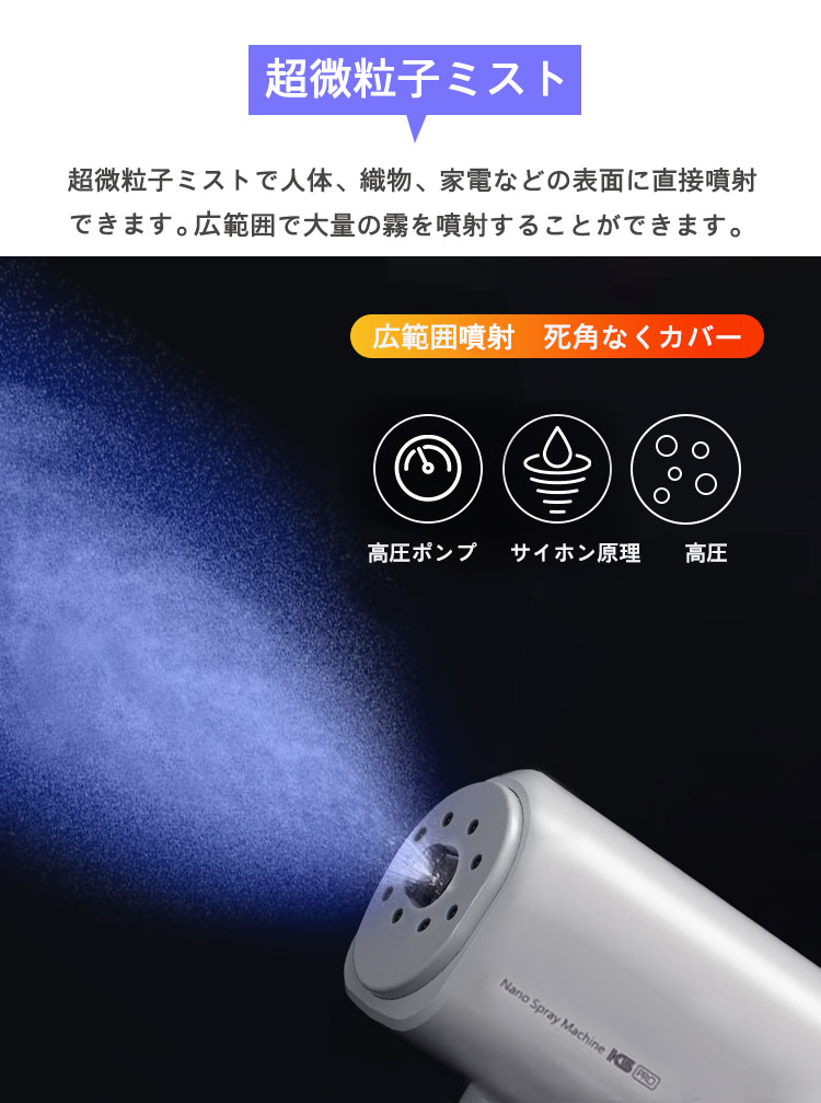 超微粒子ミストで人体、織物、家電などの表面に直接噴射 できます。範囲で大量の霧を噴射することができます。