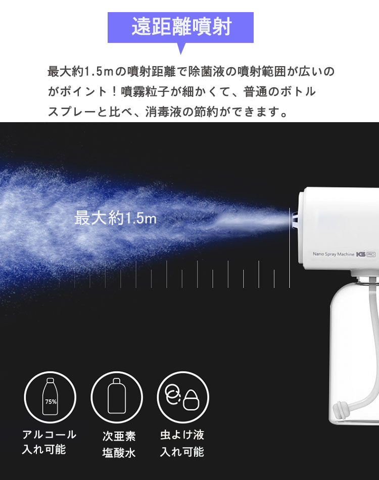 最大約1.5mの噴射距離で除菌液の噴射範囲が広いのがポイント!