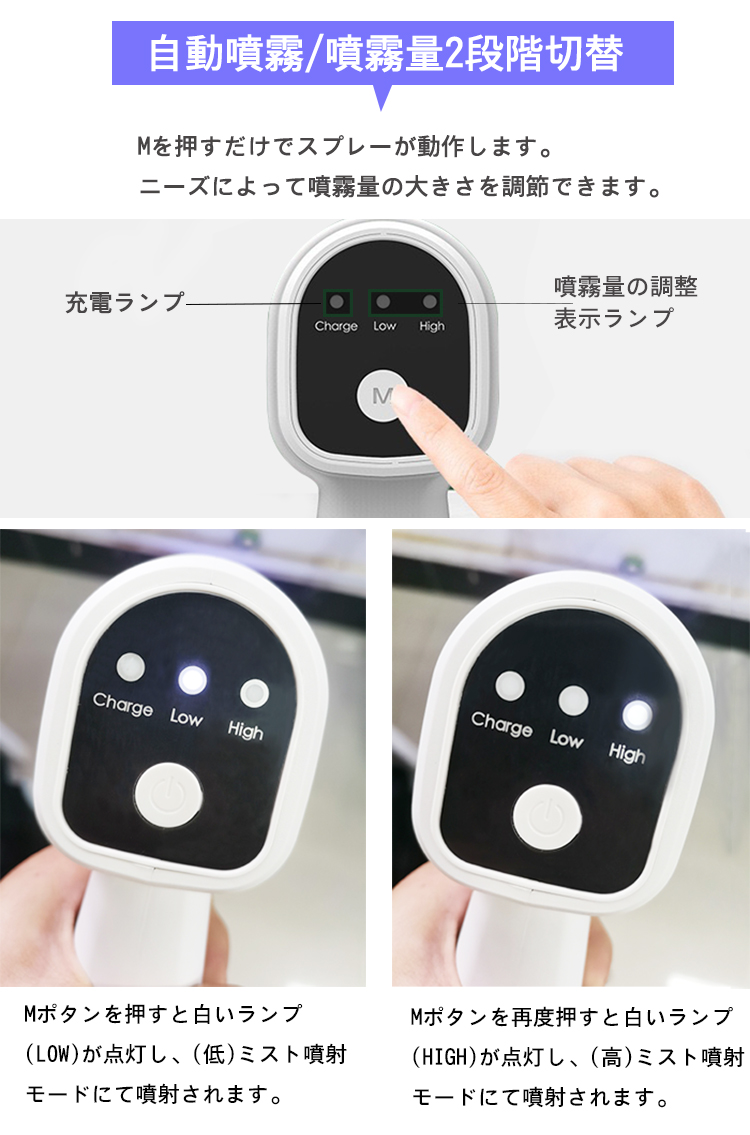 Mを押すだけでスプレーが動作します。 ニーズによって噴霧量の大きさを調節できます。