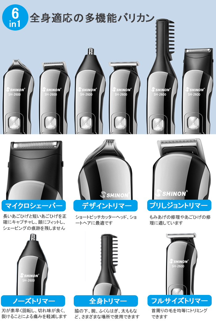 【1台6役】 バリカン 子供 すね毛 シェーバー 髭剃り 鼻毛カッター 電気シェーバー 多機能 散髪 防水 IPX7防水 コードレス 子供 メンズ ヘア カット トリミング ボディ トリマー ヘアカッター 散髪 電動バリカン 男 万能