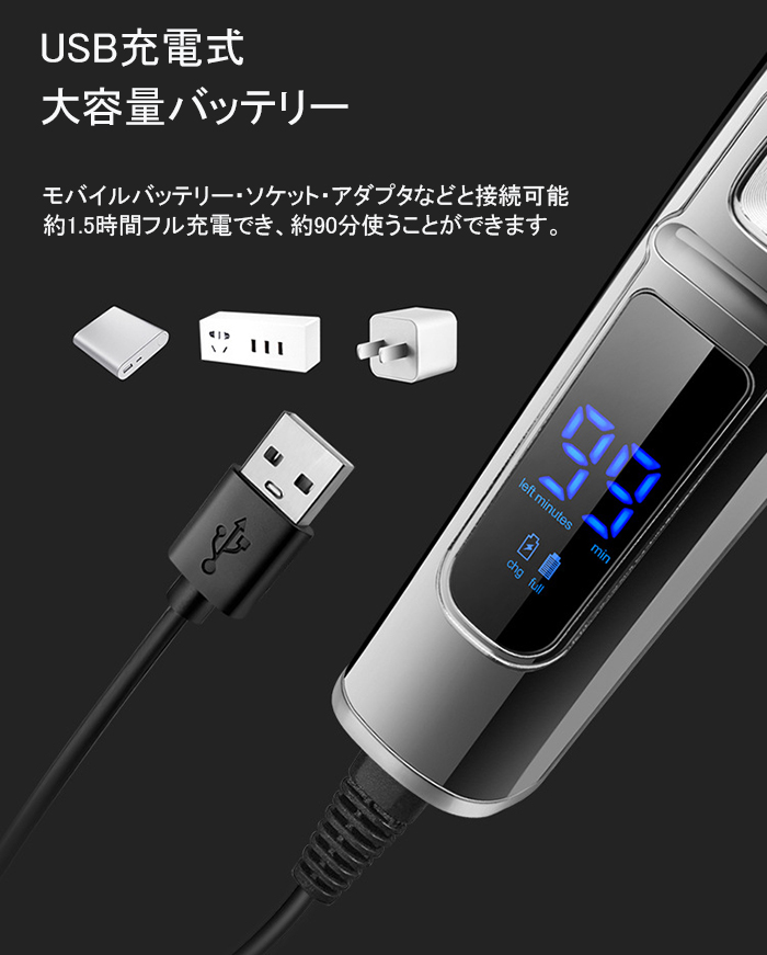 モバイルバッテリー・ソケット・アダプタなどと接続可能約1.5時間フル充電でき、約90分使うことができます。