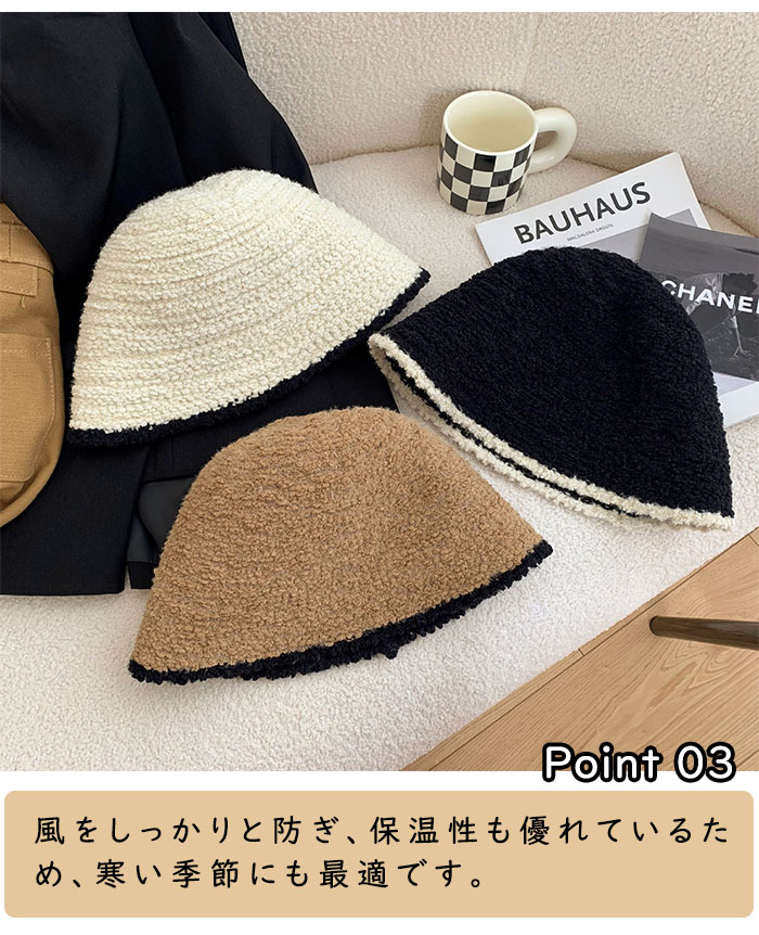 このバケットハットは、秋冬の寒さから守る防風・防寒機能を備えたニット帽です。