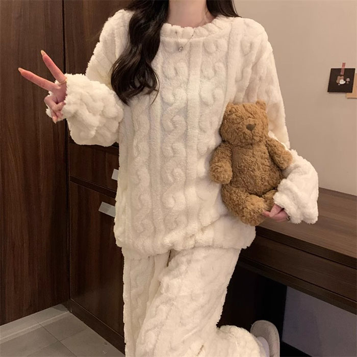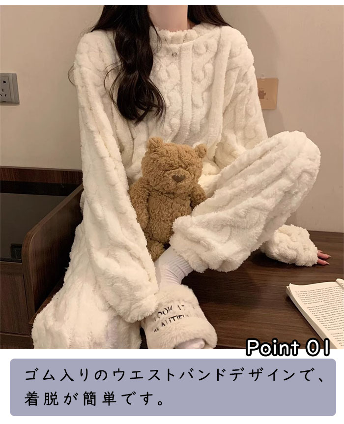 パジャマ レディース フランネル ルームウェア 上下セット ゆったり ふわふわ もこもこ 長袖 保温 防寒 裏起毛 厚手 秋冬 暖かい セットアップ 女性 大人 部屋着 婦人服 寝巻き 可愛い