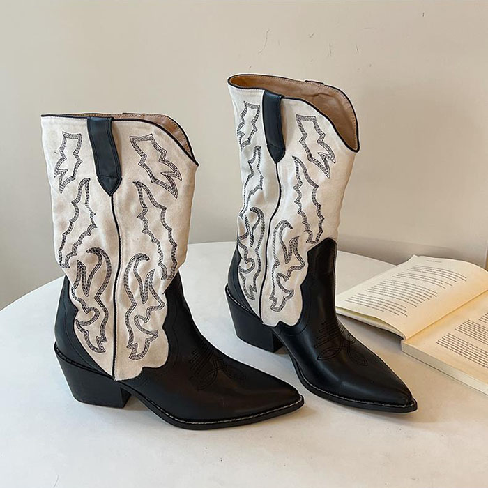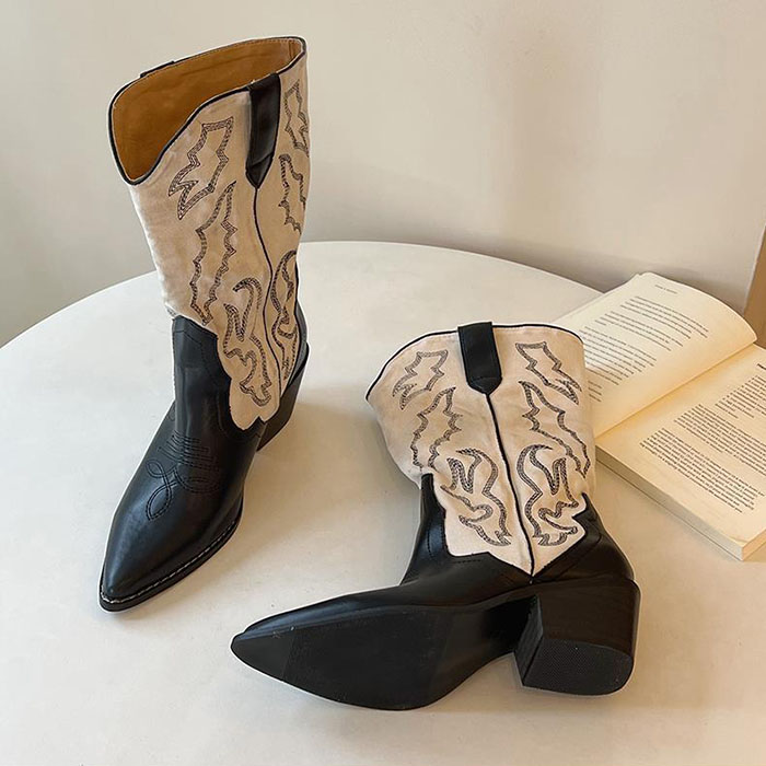 ウエスタンブーツ レディース ショートブーツ カウボーイブーツ チャンキーヒール 履き口広い 6cmヒール ポインテッドトゥ ビンテージ レザー調 歩きやすい 美脚 滑り止め 女性 大人