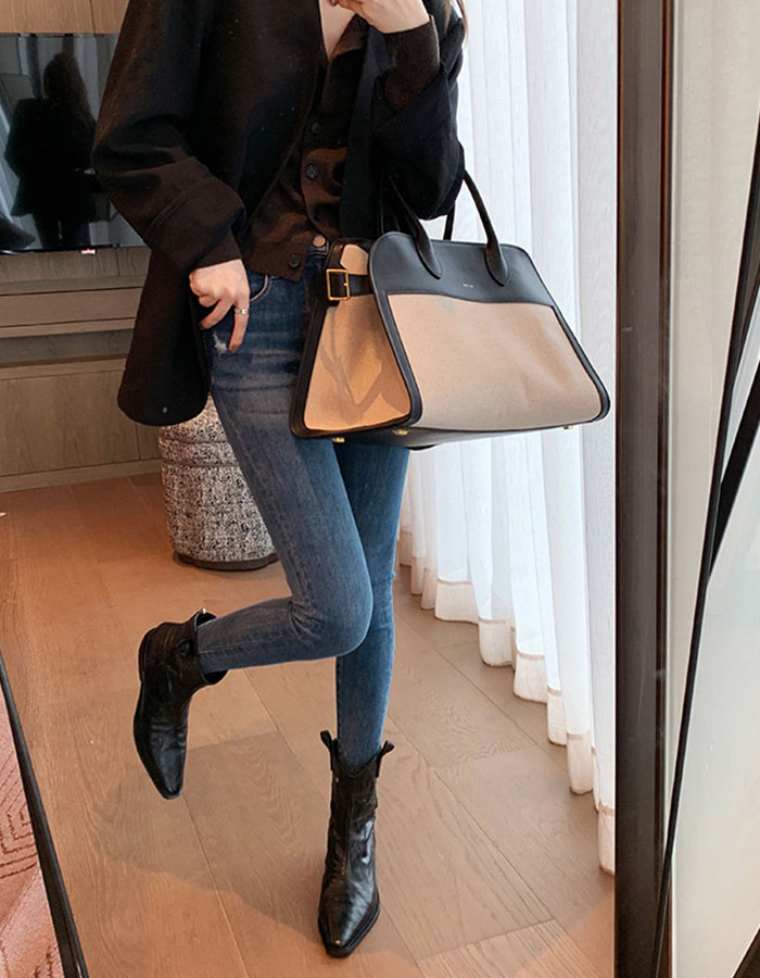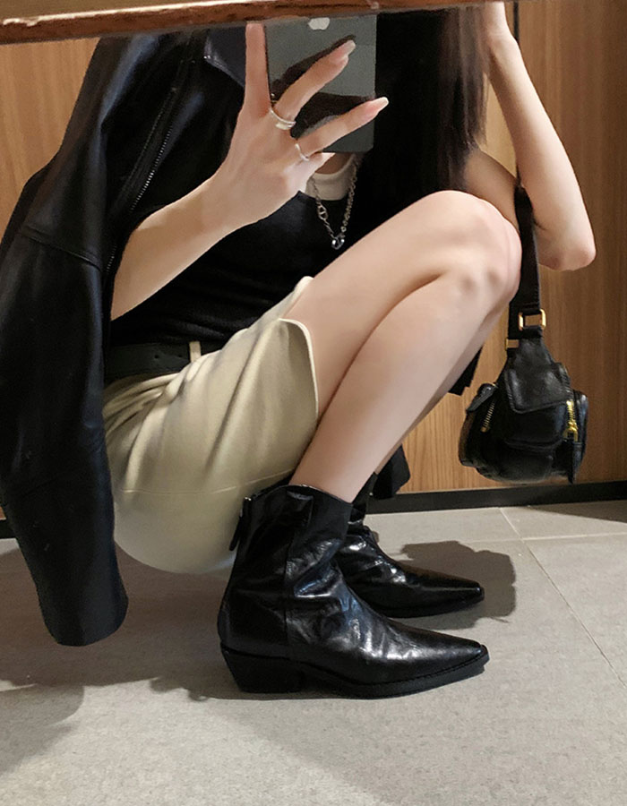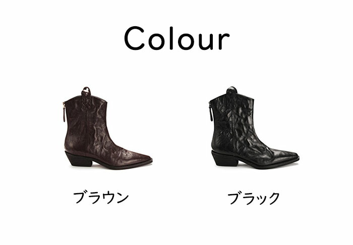 ウエスタンブーツは、シワ加工が施されたレザー調の素材で、カジュアルから通勤まで幅広いシーンで活躍します。