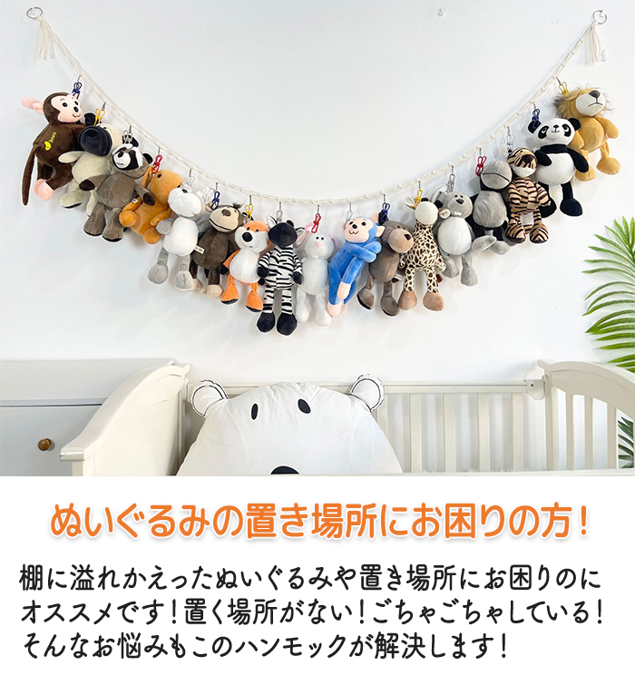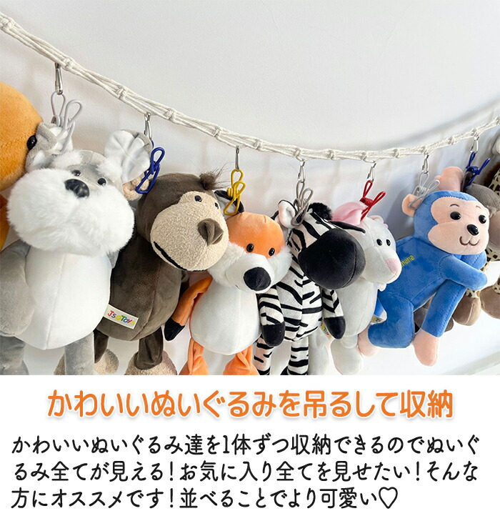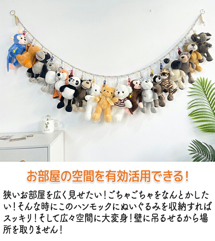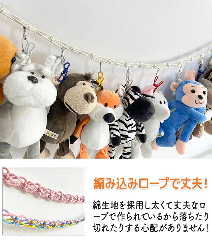 ぬいぐるみ吊り下げ収納 スッキリ整理整頓 ぬいぐるみ収納 壁掛けでぬいぐるみもスッキリ おもちゃ ドア掛け収納 見せる収納 装飾 高耐久 省スペース 多機能 多用途 取付簡単 ロープ