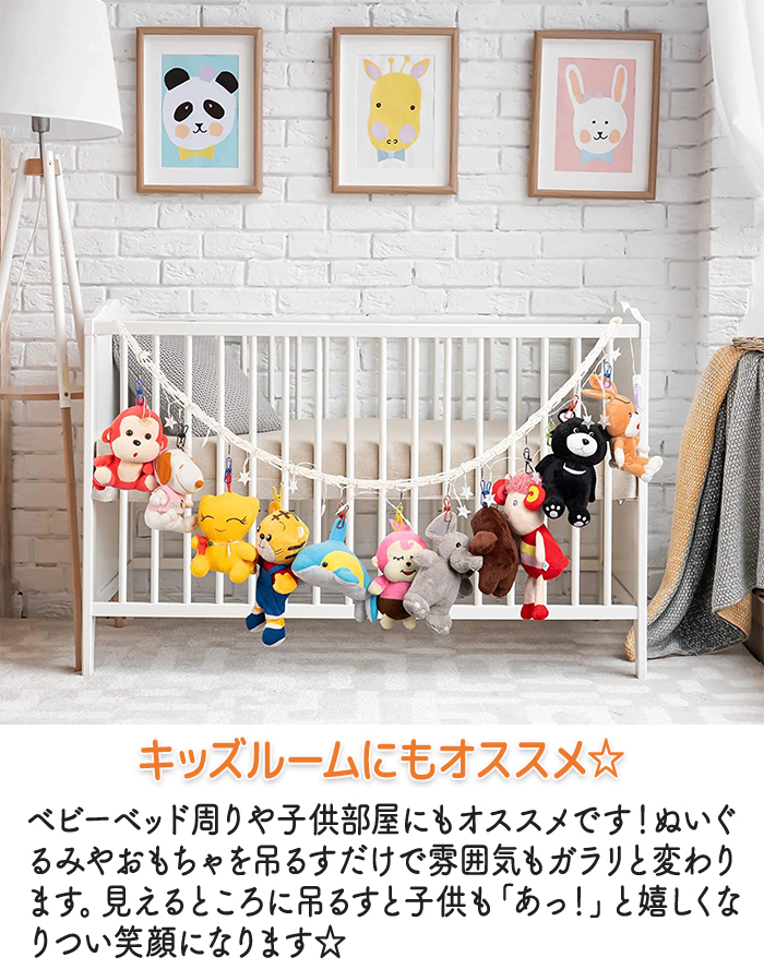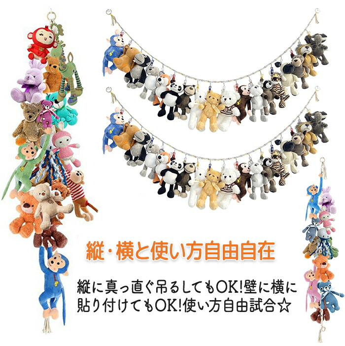 好きなぬいぐるみを並べて吊り下げれば可愛くお部屋の見た目もガラリと変わります。普段ごちゃごちゃして見えにくいぬいぐるみも吊り下げればスッキリ綺麗に見えます。ぬいぐるみが欲しいけれど置き場所が困ると言う方にもオススメです!吊り下げロープは横・縦とお使いいただけます。
