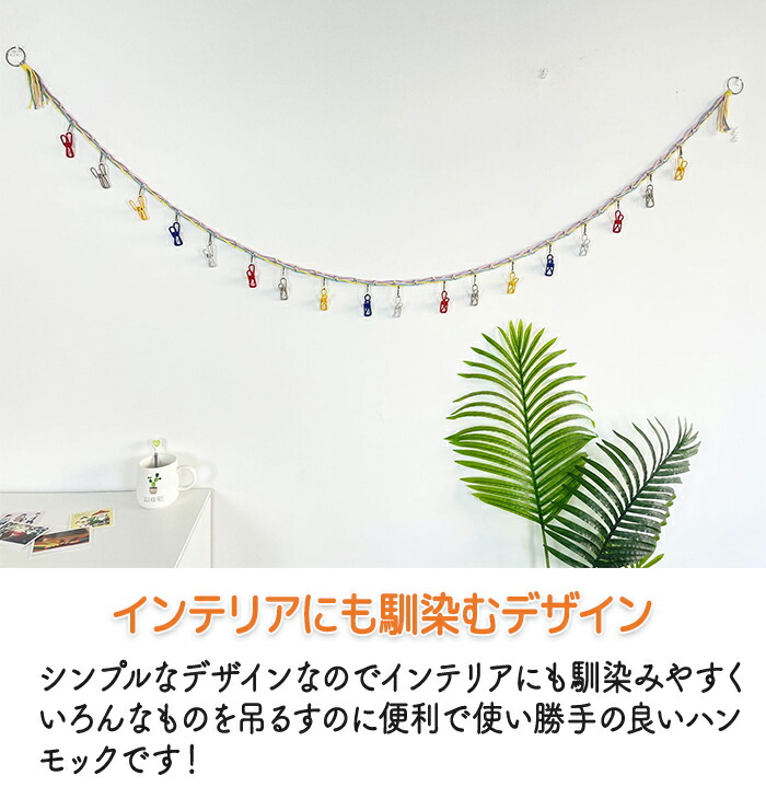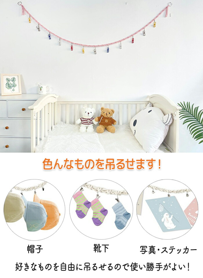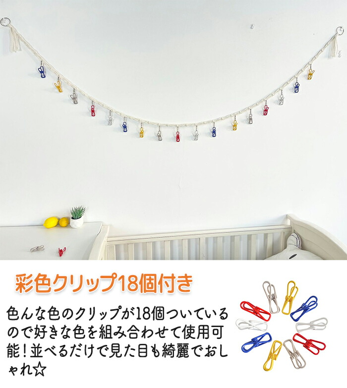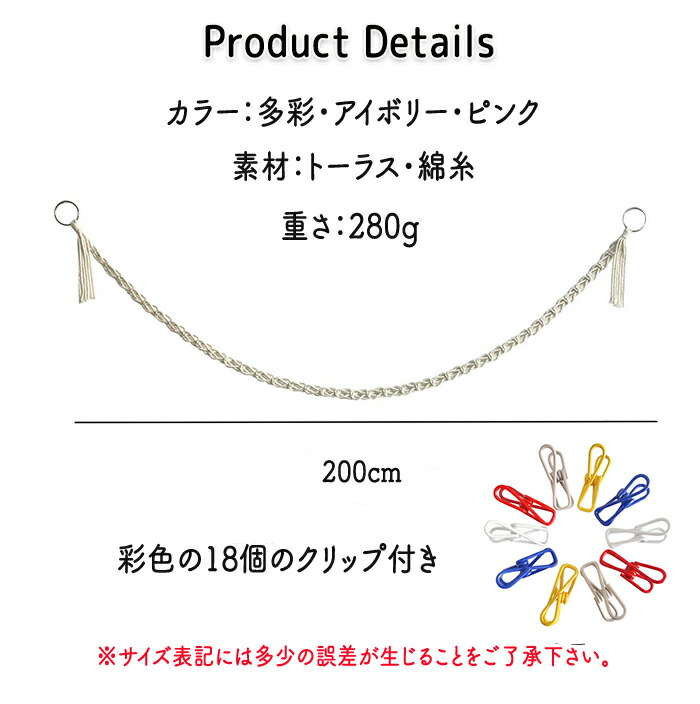 多彩・ピンク・アイボリーの3色で可愛い色合いのロープに18個のクリップ付きでさらに可愛く飾れます!