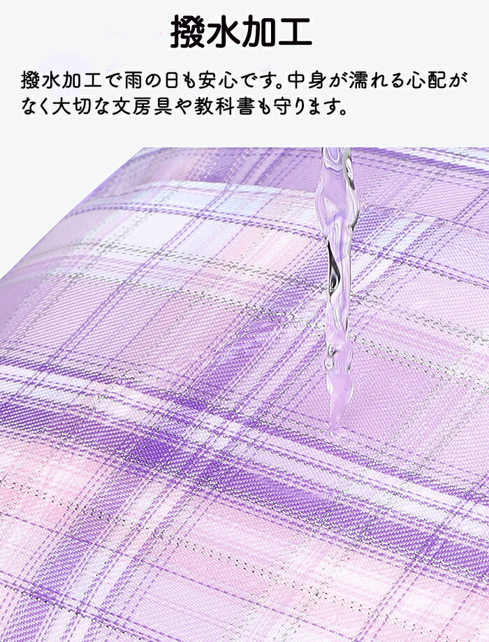 撥水加工で雨の日も心配なし!急な雨でも対応できるから雨の日の通学も安心です!中身が濡れる心配もありません。また汚れても洗濯可能で安心!