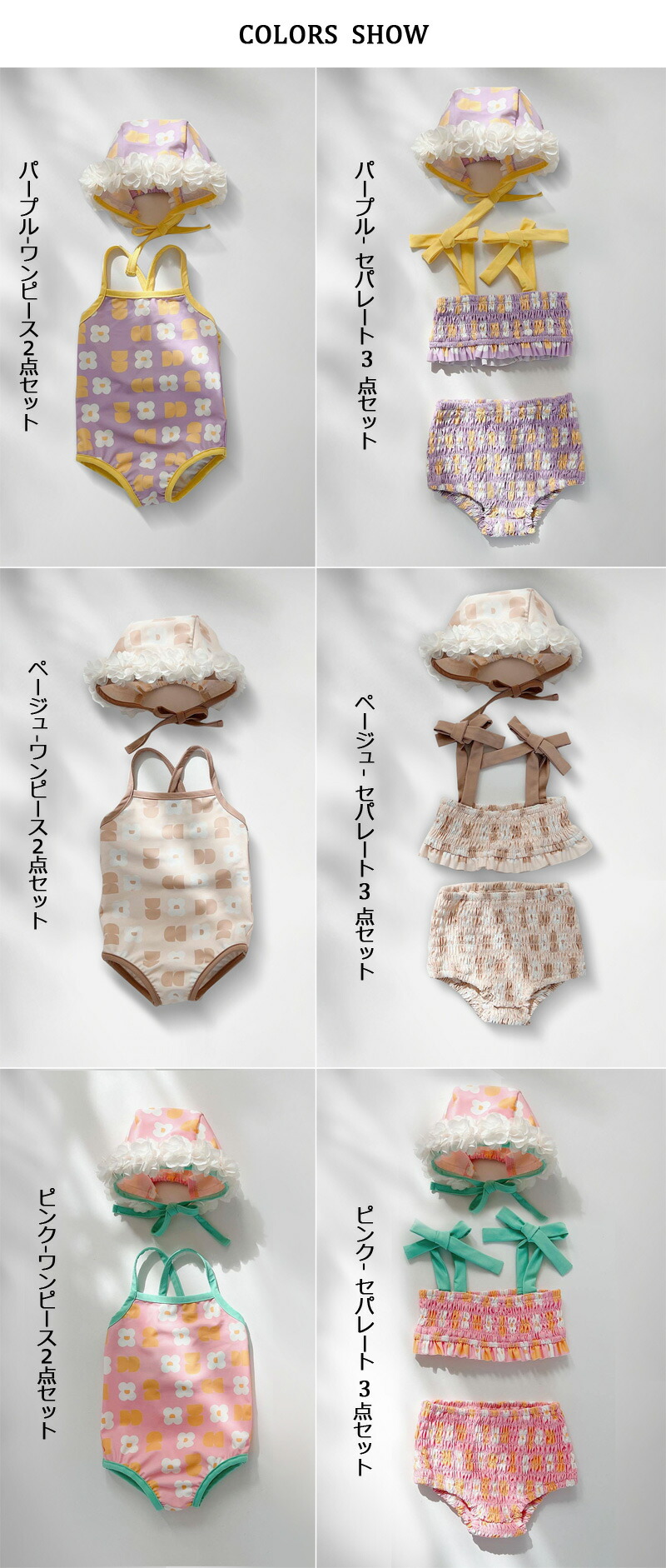 horizontal-key: パープル-ワンピース2点セット パープル-セパレート3点セット ページュ-ワンピース2点セット ページュ-セパレート3点セット ピンク-ワンピース2点セット ピンク-セパレート3点セット