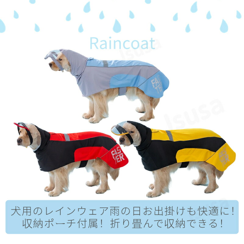 ゴールデンレトリーバーなどの大型犬用、柴犬やビーグルなど中型犬用レインウェア。