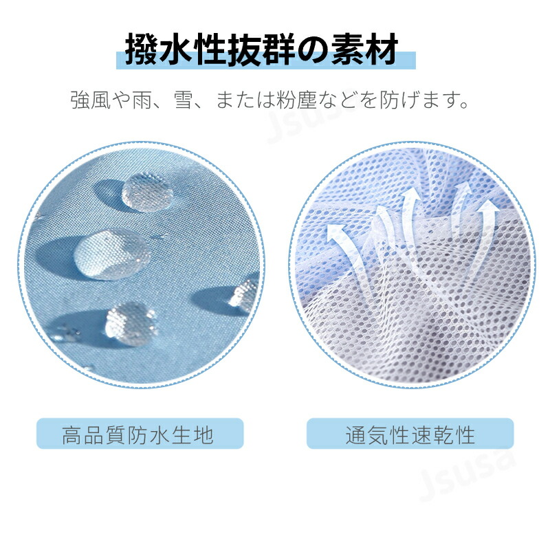 表地から縫い目まで撥水と防水加工が施されており、強風や雨、雪、または粉塵などを防げます。