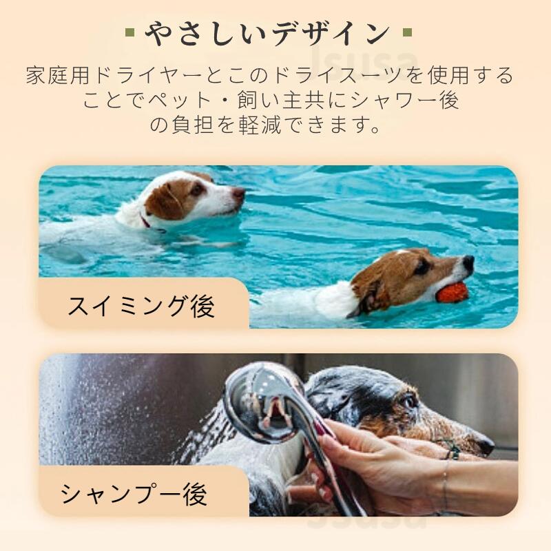 家庭用ドライヤーとこのドライスーツを使用することでペット・飼い主共にシャワー後の負担を軽減できます。