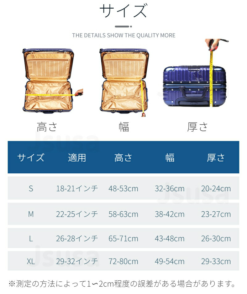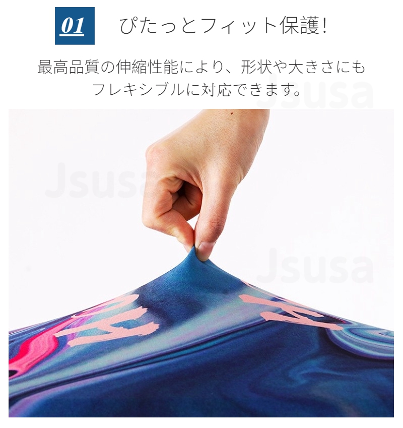 全4サイズ展開で伸縮性のある素材のため、機内持ち込みサイズから大型のスーツケースまで幅広く対応可能です。