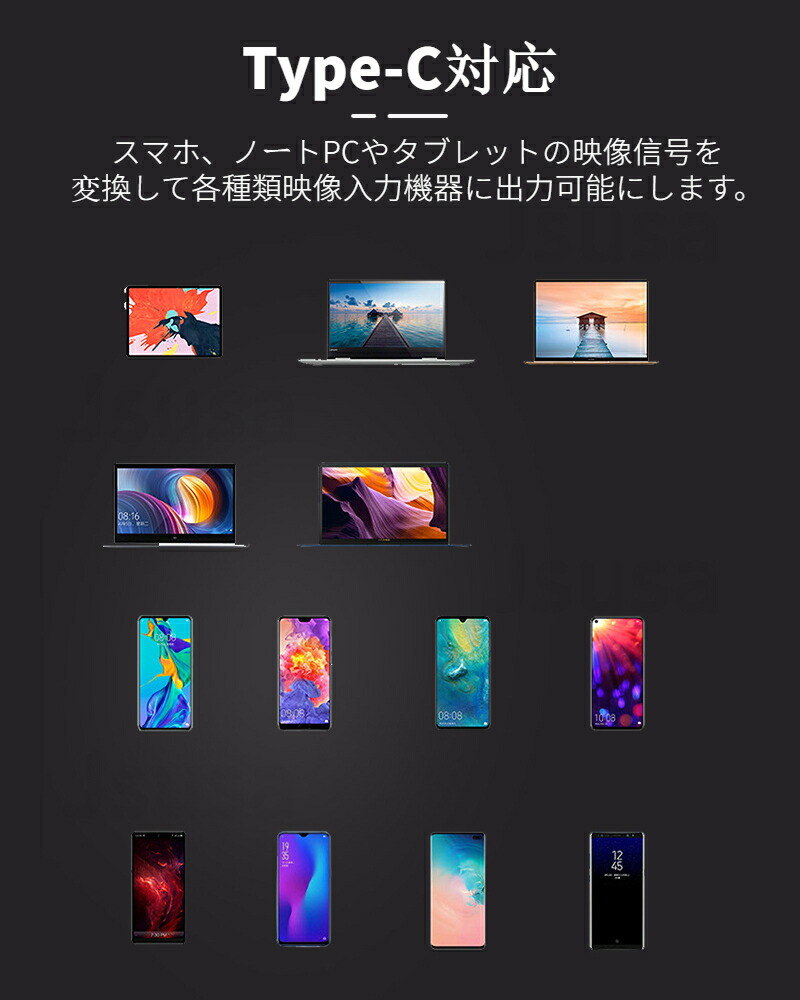 スマホ、ノートPCやタブレットの映像信号を変換して各種類映像入力機器に出力可能にします。