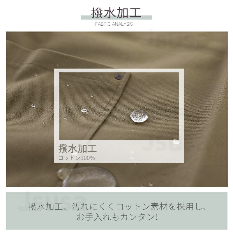 製品は撥水加工、汚れにくくコットン素材を採用し、お手入れもカンタン!シワになりにくいし通気性も抜群!