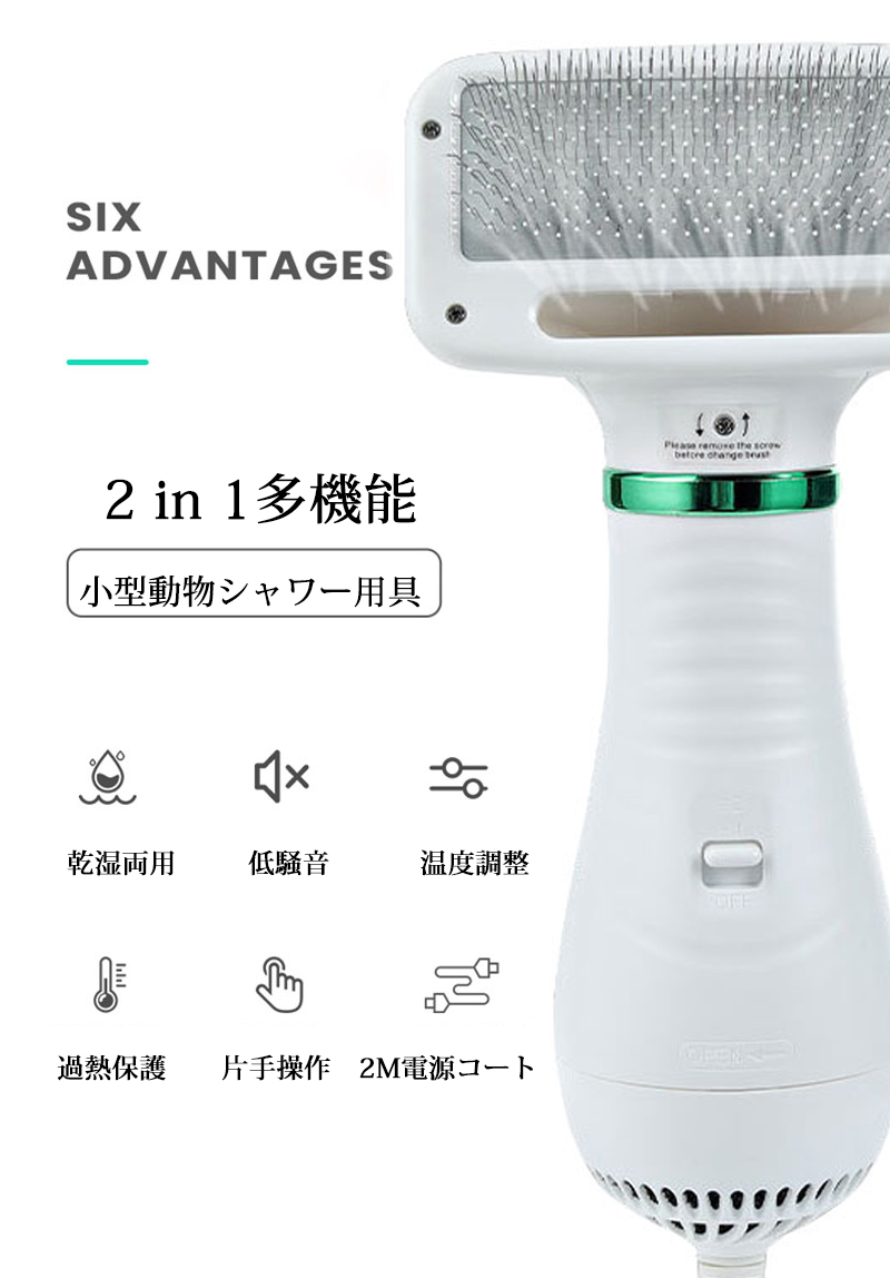 ペットブラシがついた2in1ペット用ドライヤー 猫犬用 グルーミング ヘアドライヤー ペットブラシ ペットケア美容 1台2役 家庭用 シャワー お風呂