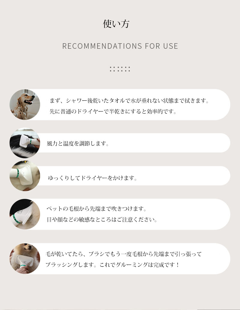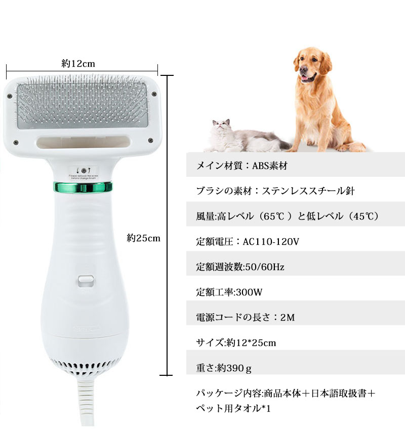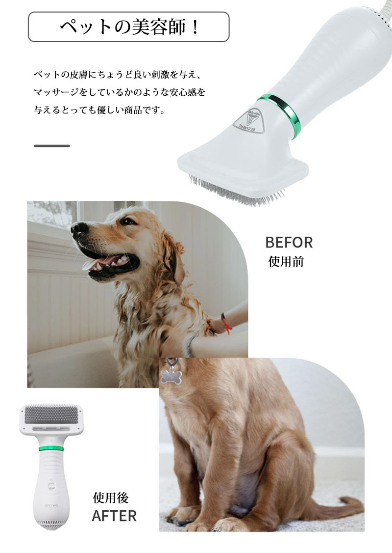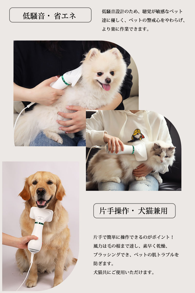 ペットの毛の乾燥と整理がとにかく面倒で一苦労ですよね。しかし、自然乾燥には 皮膚病や風邪になる恐れもあります。それでは、ペットドライヤー・ブラシご紹介! 本製品はペットのヘアドライヤーとブラシという二つの機能を持っています。 乾燥、整理をより快適に、お金も節約できるし、ペットちゃんの皮膚病なども 減らします。
