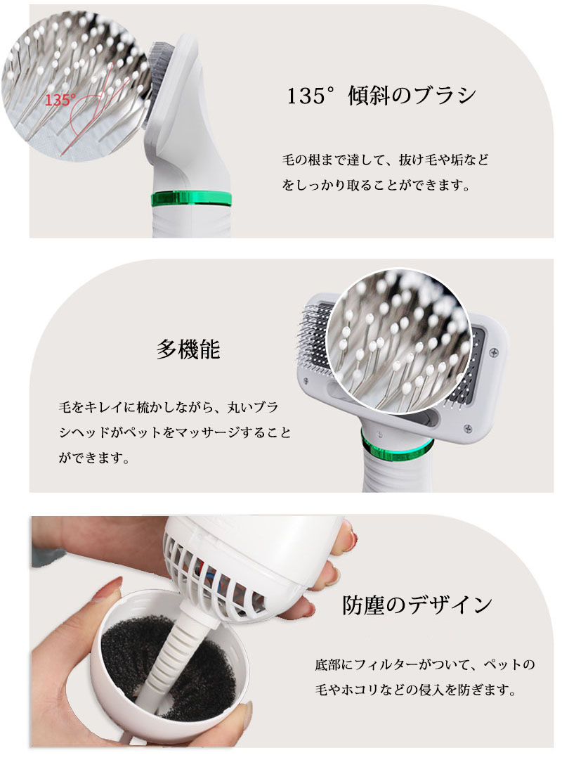 毛の根まで達して、抜け毛や垢などをしっかり取ることができます。 円形針で毛をキレイに整理しながら、 ペットにマッサージできることができます。 底部にフィルターがついており、 ペットの毛やホコリなどの侵入を防止 できます。