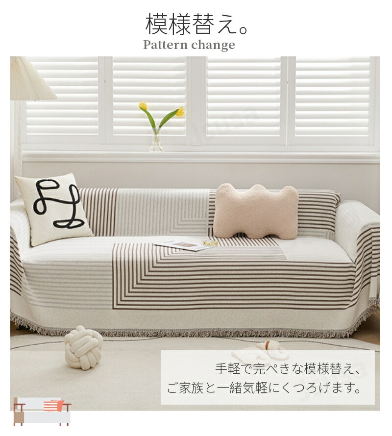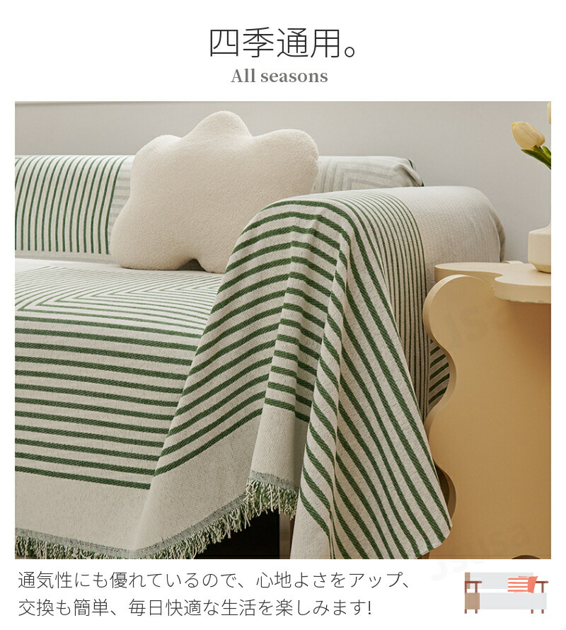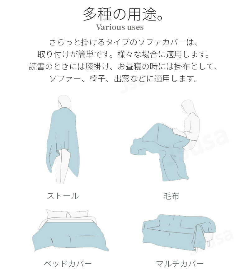 ソファー、椅子のカバーとして使用できるだけではなく、読書のときには膝掛け、お昼寝の時には掛布、 旅行の時には毛布としても適用します。また出窓や床に敷いてシーツやカーペットにもなります。