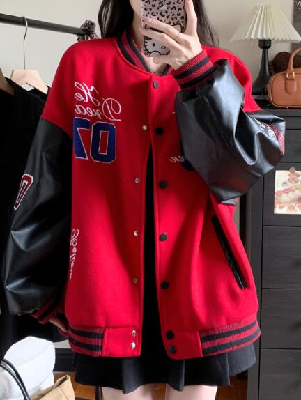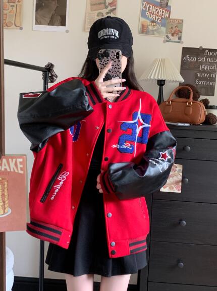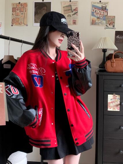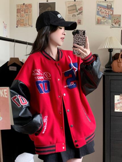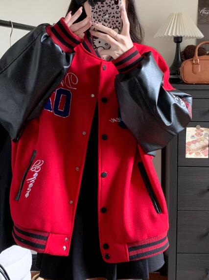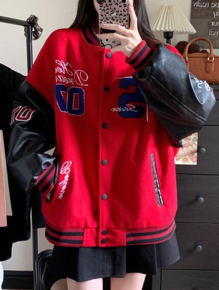 刺繍フェイクレザー切替ナンバースタジャ