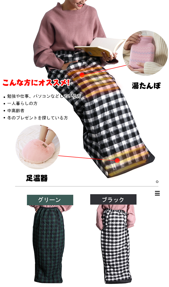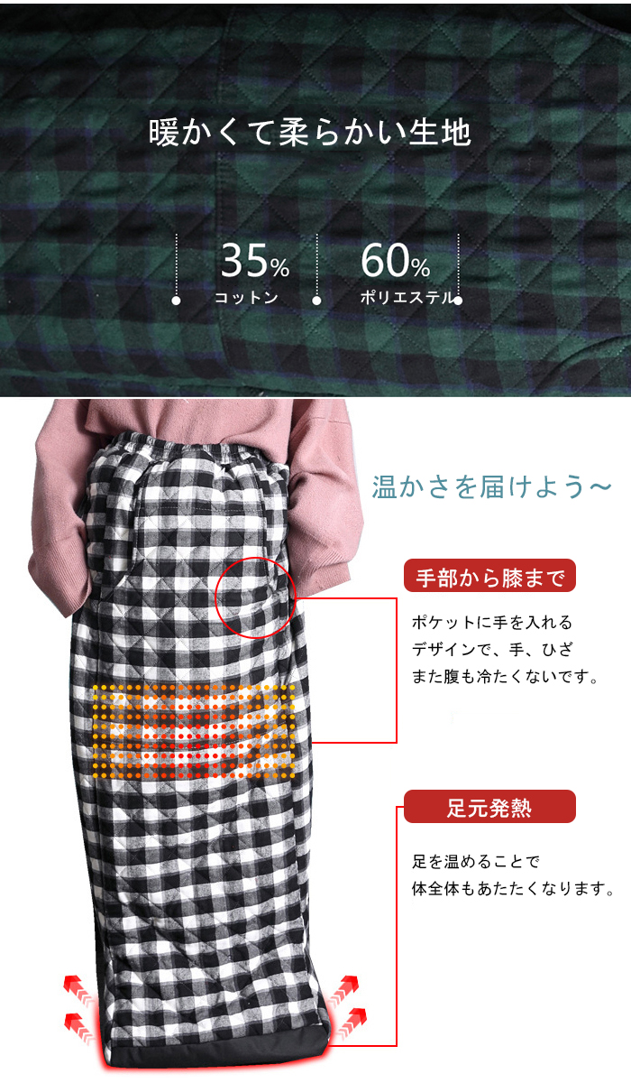 足を温めるだけでなく、ポケットに手を入れるデザインで、手、ひざまた腹も冷たくないです。