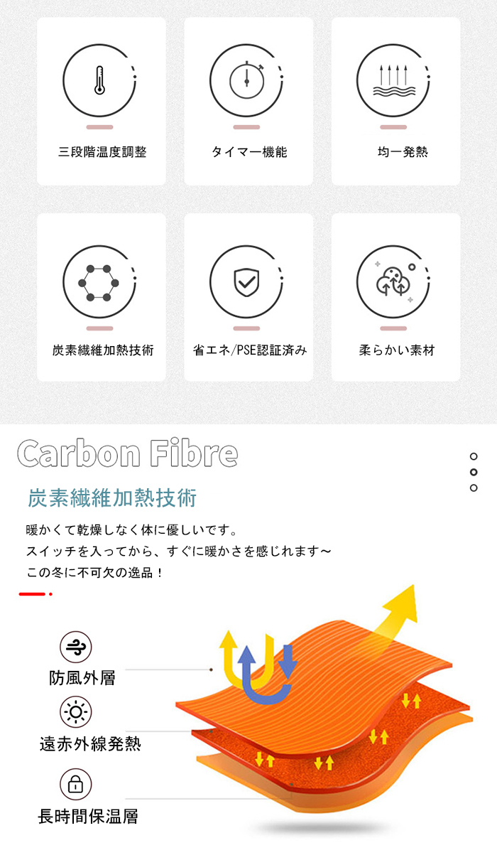炭素繊維加熱技術を採用し、暖かくて乾燥しなく体に優しいです。 スイッチを入ってから、すぐに暖かさを感じれます~ この冬に不可欠の逸品!