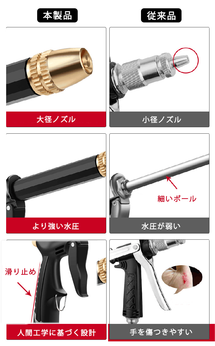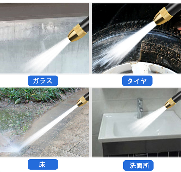 ノズルを回すだけでスプレモードを調整可能です。車を洗う、窓を洗う床を洗う、庭に水 をやるなども自由に調整できます。