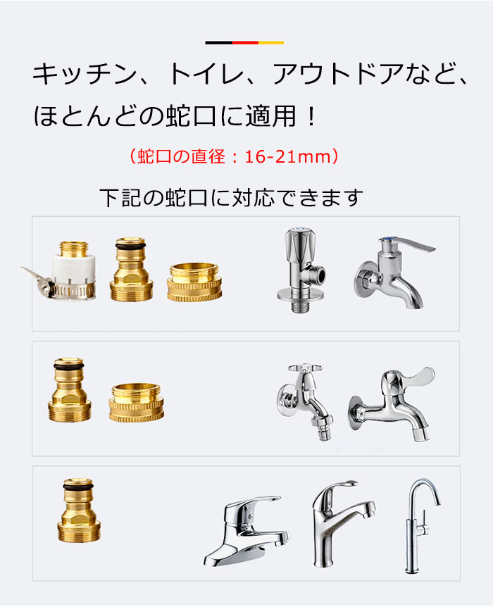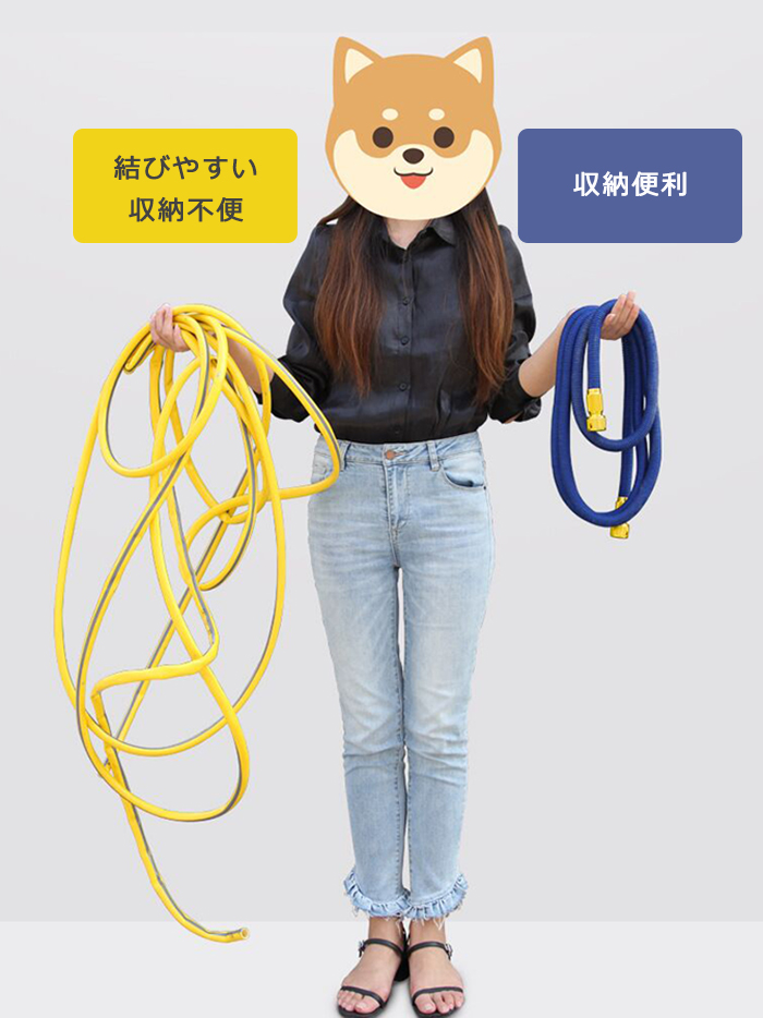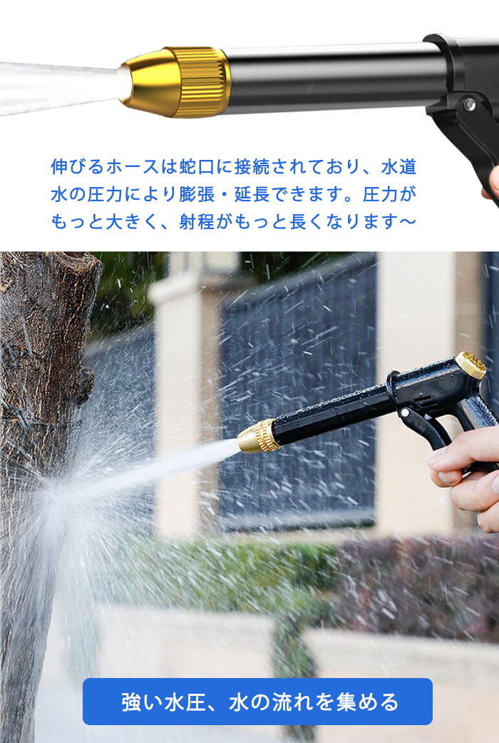 伸びるホースは蛇口に接続されており、水道水の圧力により膨張・延長できます。圧力が もっと大きく、射程がもっと長くなります~