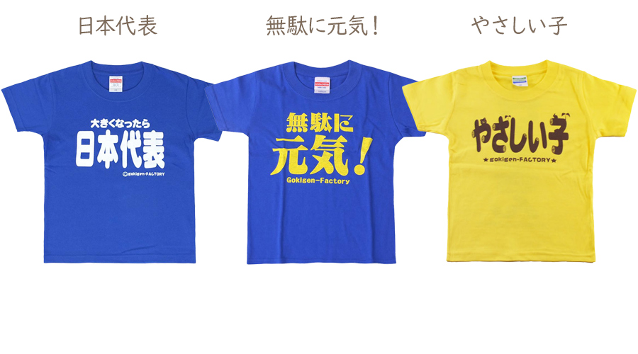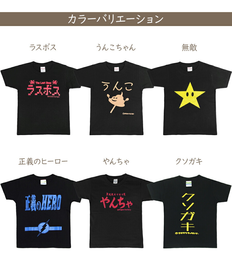-: ラスボス (品番00229) うんこちゃん (品番19009) 無敵 (品番19048) 正義のヒーロー (品番00111) やんちゃ (品番00181) クソガキ (品番00098) おてんば娘ブラック (品番00180) おてんば娘ピンク (品番00180) 天真爛漫 (品番00110) NoだっこNoLifeピンク (00113) NoだっこNoLifeネイビー (00113) 元気爆発 (品番00096) 日本代表 (品番00166) 無駄に元気! (品番00143) やさしい子 (品番00108)