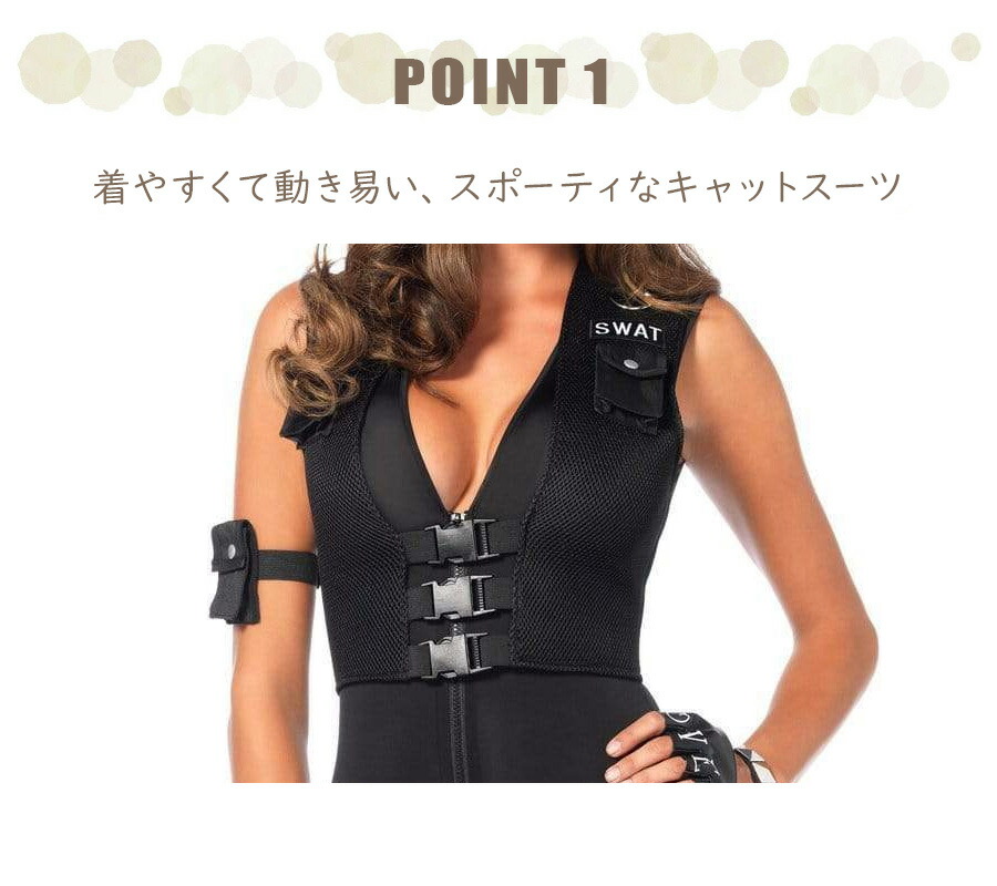 スポーティーなキャットスーツに、編み上げのコルセット風デザインが可愛さをプラス! 収縮性のある素材で、着やすく動きやすです。