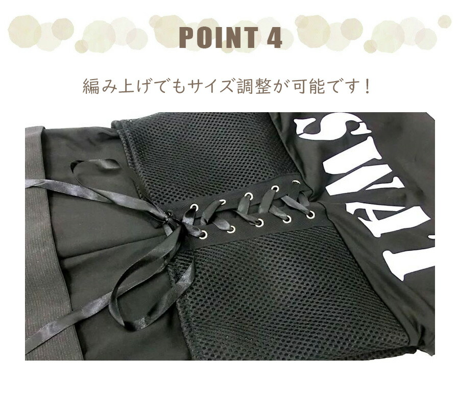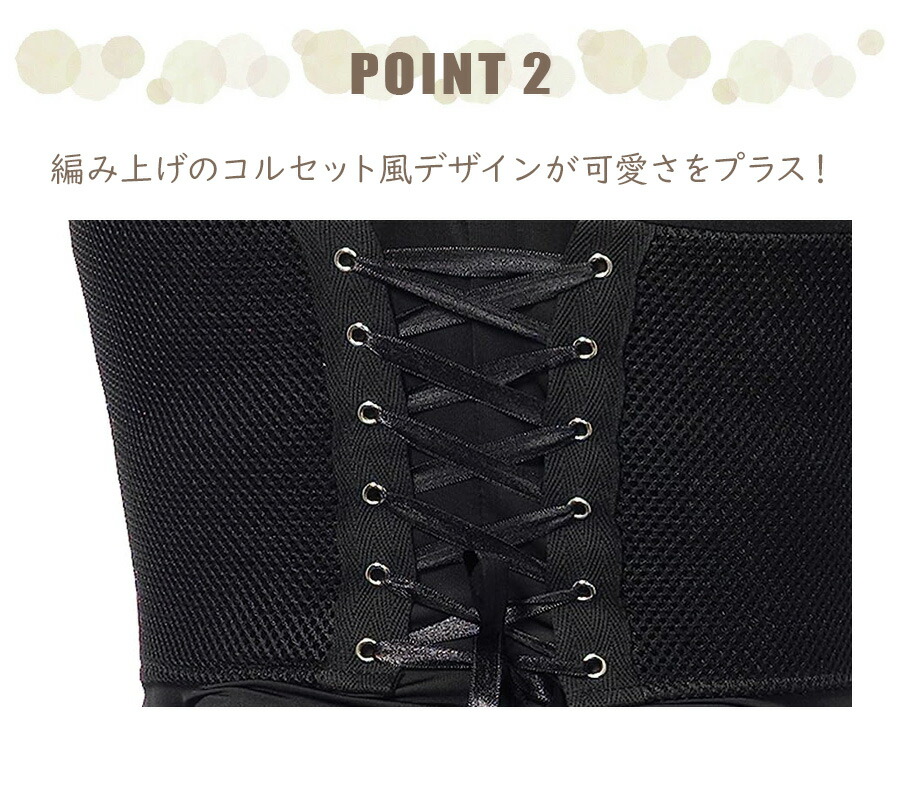ウエストバンドや、バックの編み上げを絞めれば、ウエストを細く見せてくれます♪