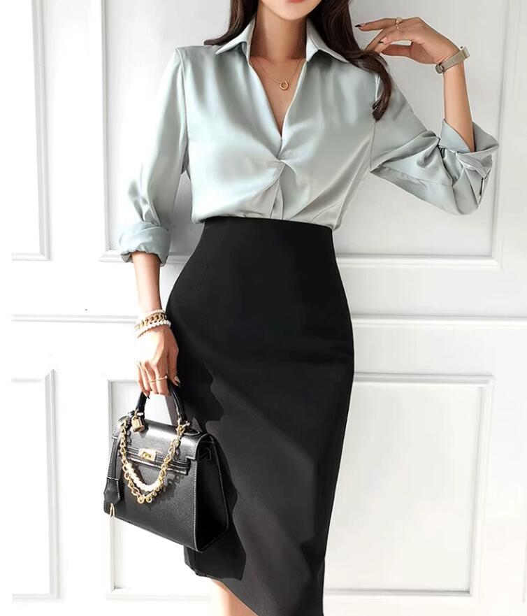 シンプルなブラウスを合わせばスタイリッシュなオフィススタイルに。