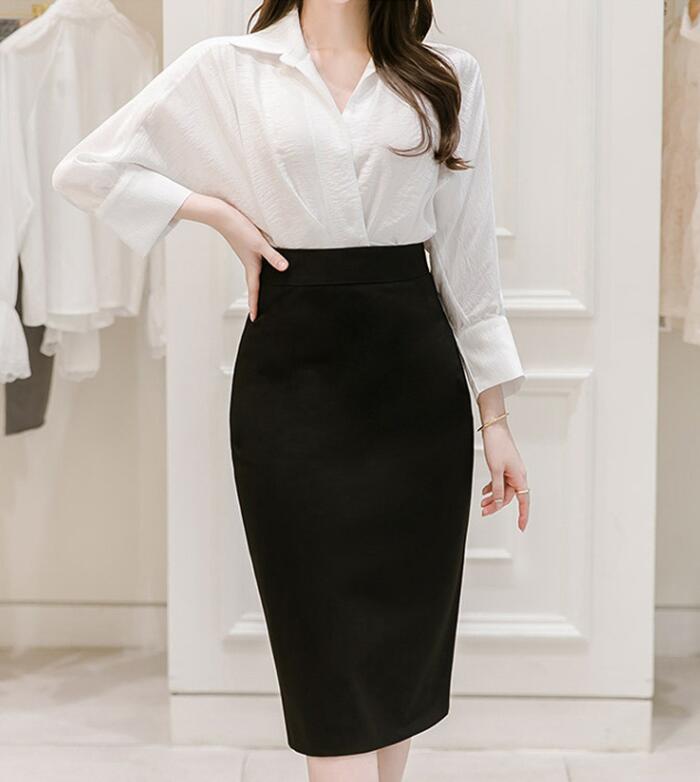 シンプルなブラウスを合わせばスタイリッシュなオフィススタイルに。