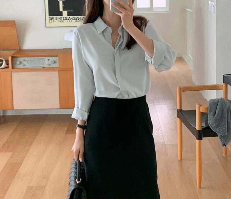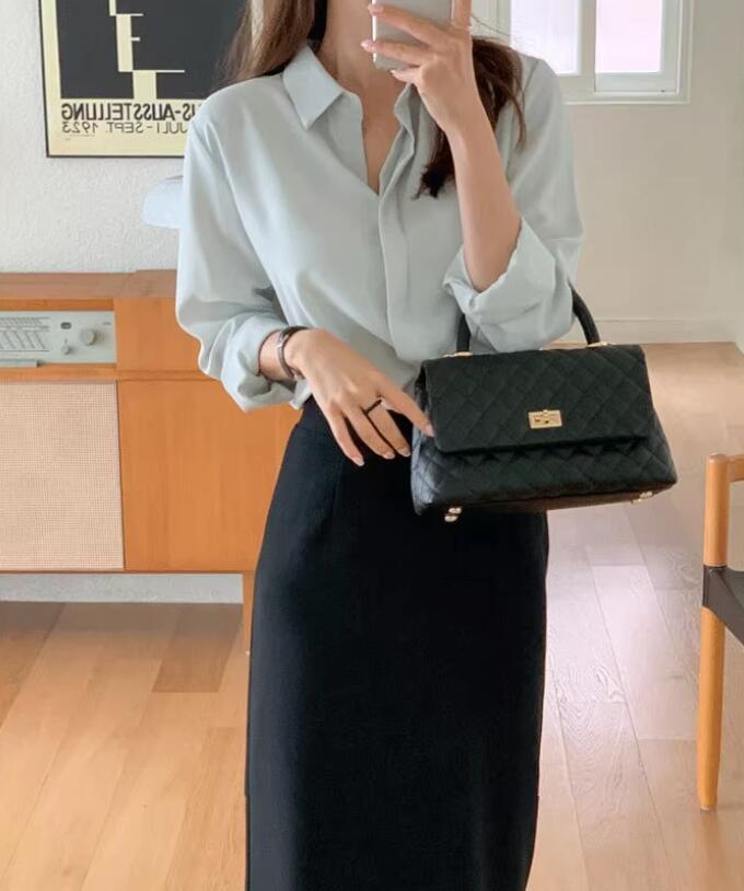 シンプルなブラウスを合わせばスタイリッシュなオフィススタイルに。