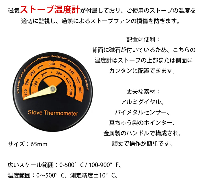 磁気ストーブ温度計が付属しており、ご使用のストーブの温度を適切に監視し、過熱によるストーブファンの損傷を防ぎます。