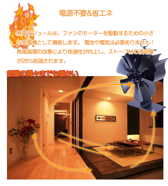 熱電モジュールは、ファンのモーターを駆動するための小さ な発電機として機能します。 電池や電気は必要ありません! 熱風循環の改善により快適性が向上し、ストーブ材の使用量 が28%削減されます。