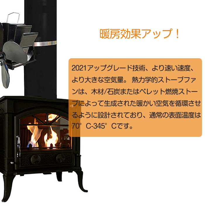 2021アップグレード技術、より速い速度、より大きな空気 量。 熱力学的ストーブファンは、木材/石炭またはペレット 燃焼ストーブによって生成された暖かい空気を循環させるよ うに設計されており、通常の表面温度は70°C-345°Cです。
