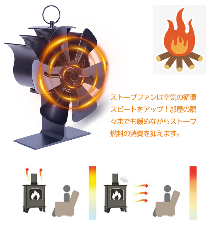 ストーブファンは空気の循環スピードをアップ!部屋の隅 々までも暖めながらストーブ燃料の消費を抑えます。