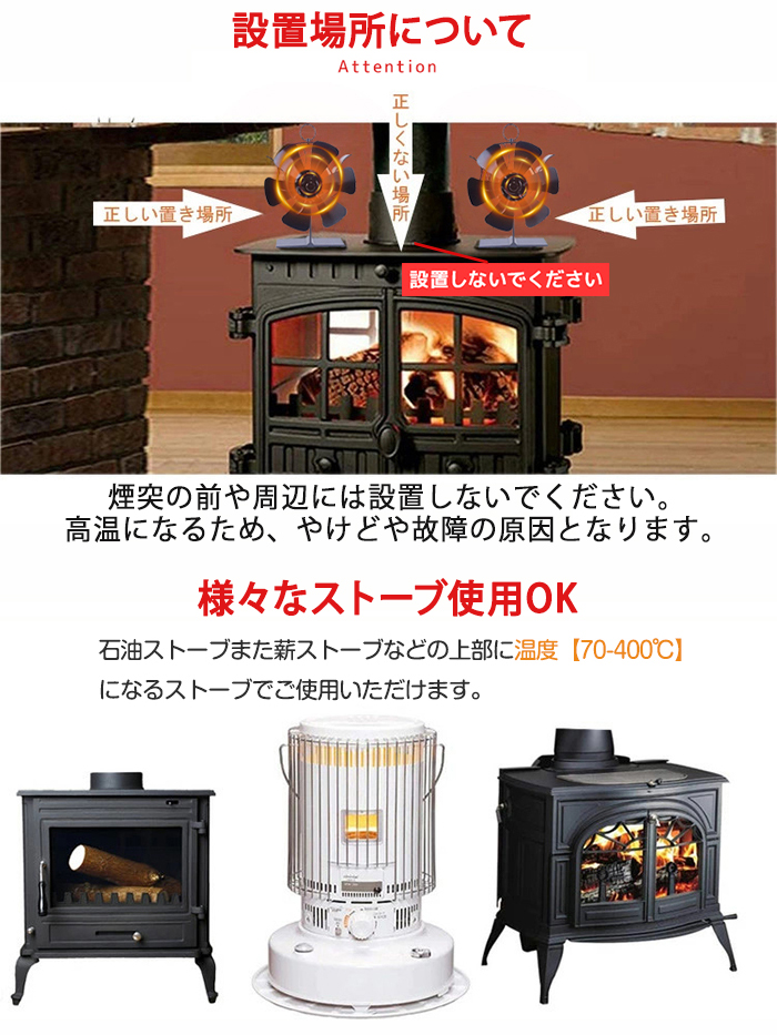対応ストーブ :石油ストーブや薪ストーブ、ストーブ上部が高熱になるタイプのストーブ