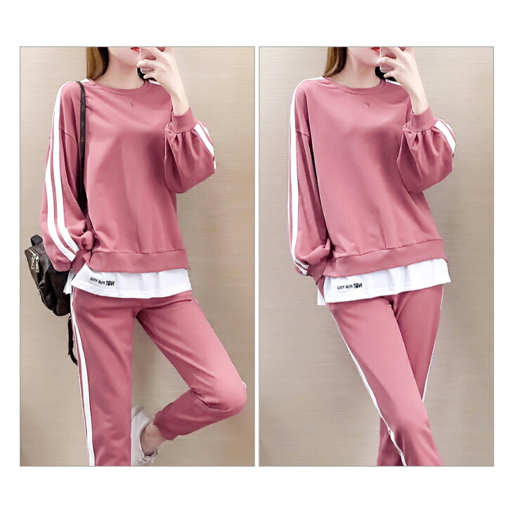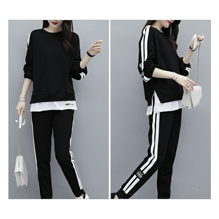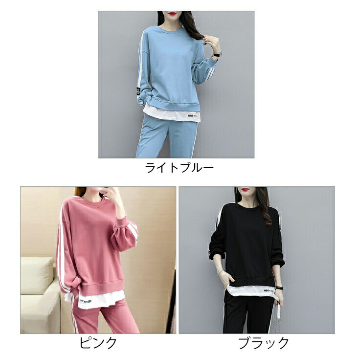 二本ライン レイヤード風でスポーティな上下セットアップが新登場☆レディースファッション トップス スウェット トレーナー