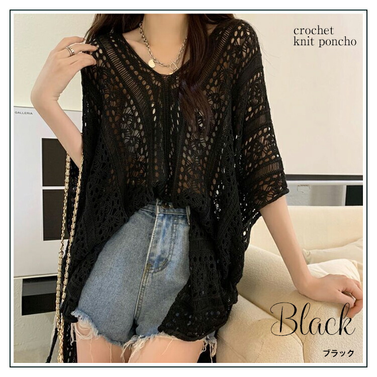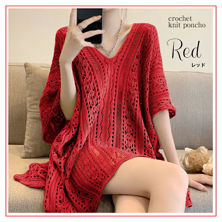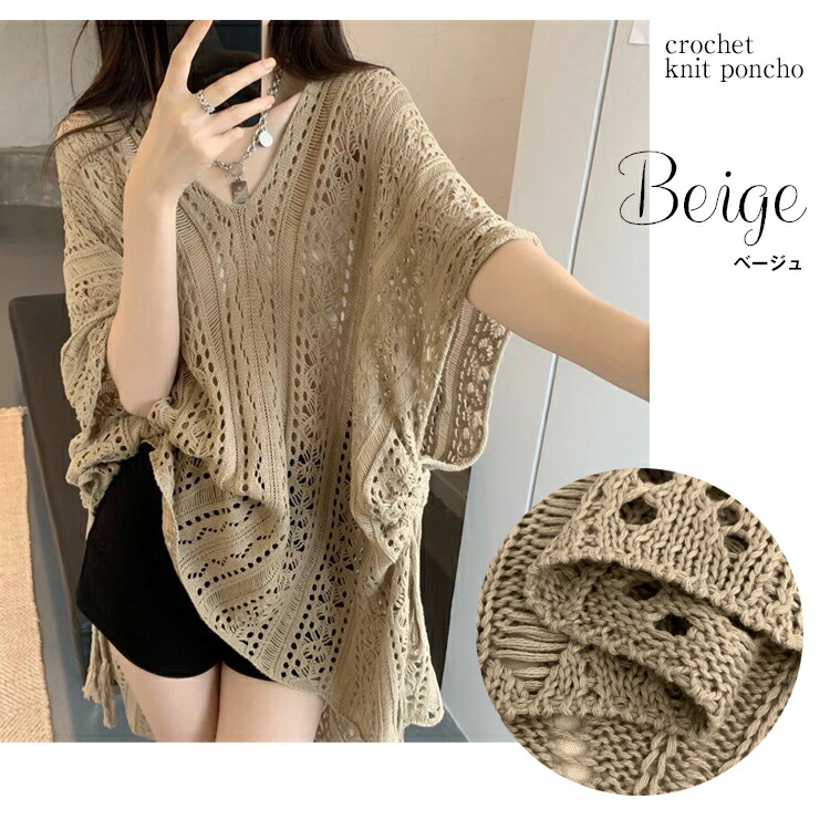 かぎ編みVネックポンチョ風ドルマンチュニック 春夏 透かし編みニット チュニック レディース トップス Vネック 重ね着 メッシュニット サマーニット 薄手 透け感アイテム レディース