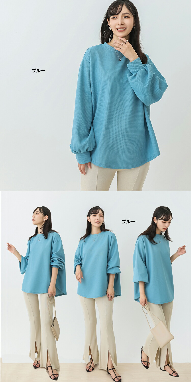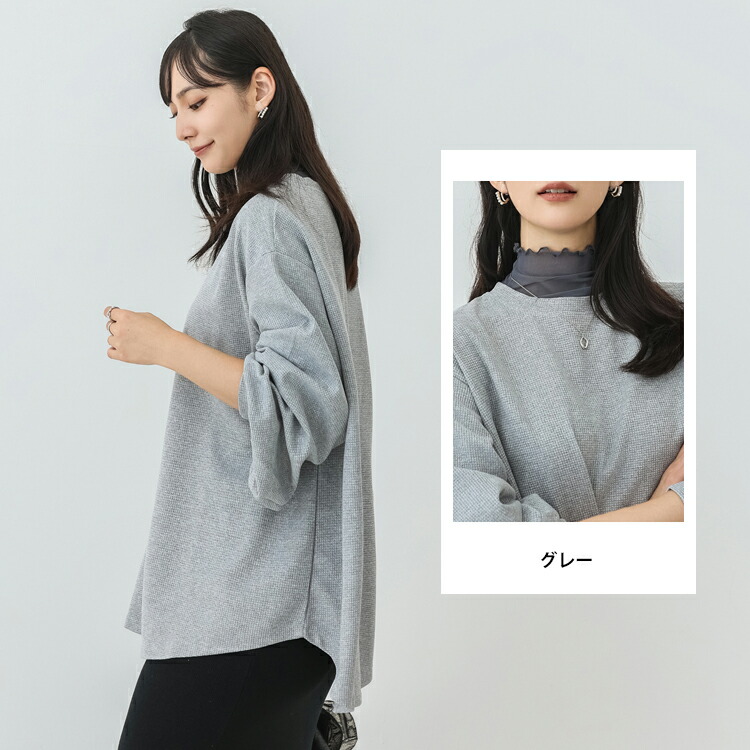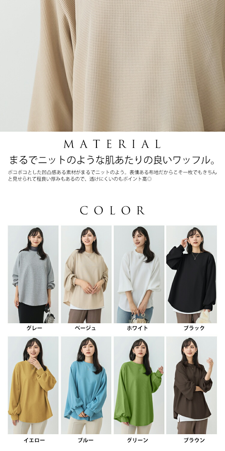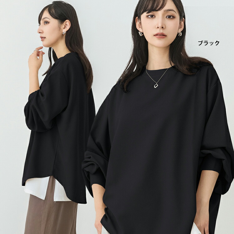 ☆2点目300円OFFクーポン☆レディース 秋冬 ワッフル ロングTシャツ 長袖 ラウンドネック レディーストップス ロンT 長袖 ロングプルオーバー 重ね着 ミディアム トップス 着丈 前後差