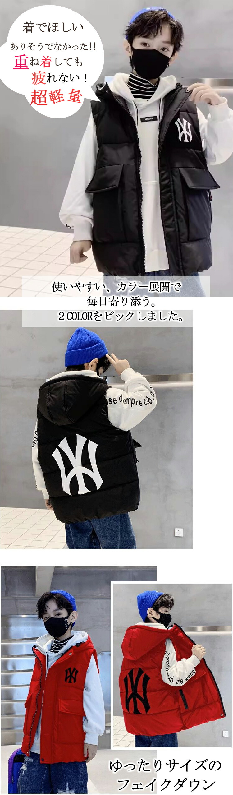 ☆2点目300円OFFクーポン☆ キッズアウター ダウンベスト フェイクダウン 中綿 アウター キッズベスト 秋冬 ノースリーブ 上着 ポケット付き プリントロゴ ファスナー ジップ 暖かい